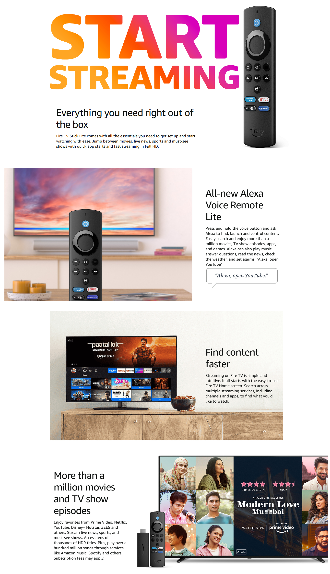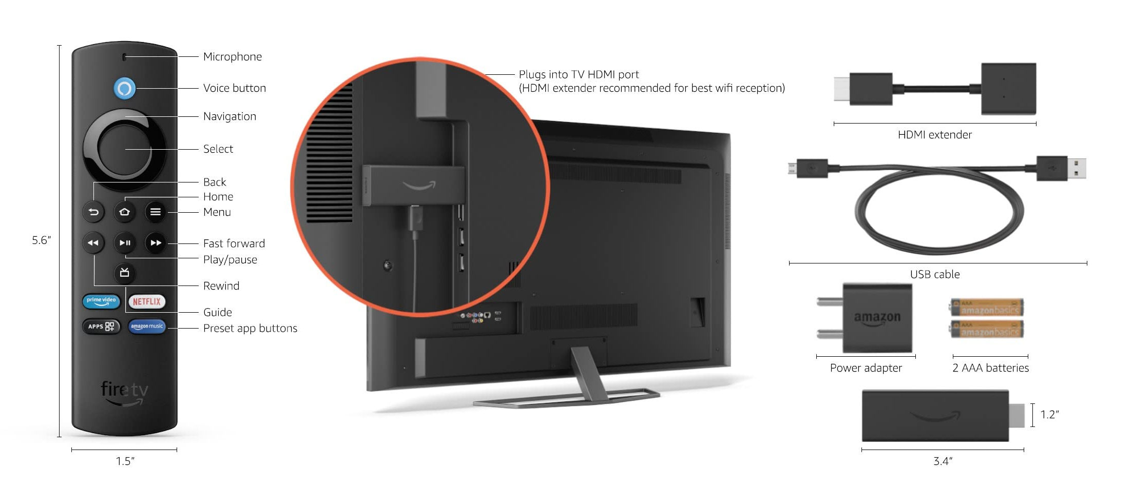 | Included in the box | Fire TV Stick Lite, Alexa Voice Remote Lite, USB cable and power adapter, HDMI extender, 2 AAA Alkaline batteries, Quick Start Guide |