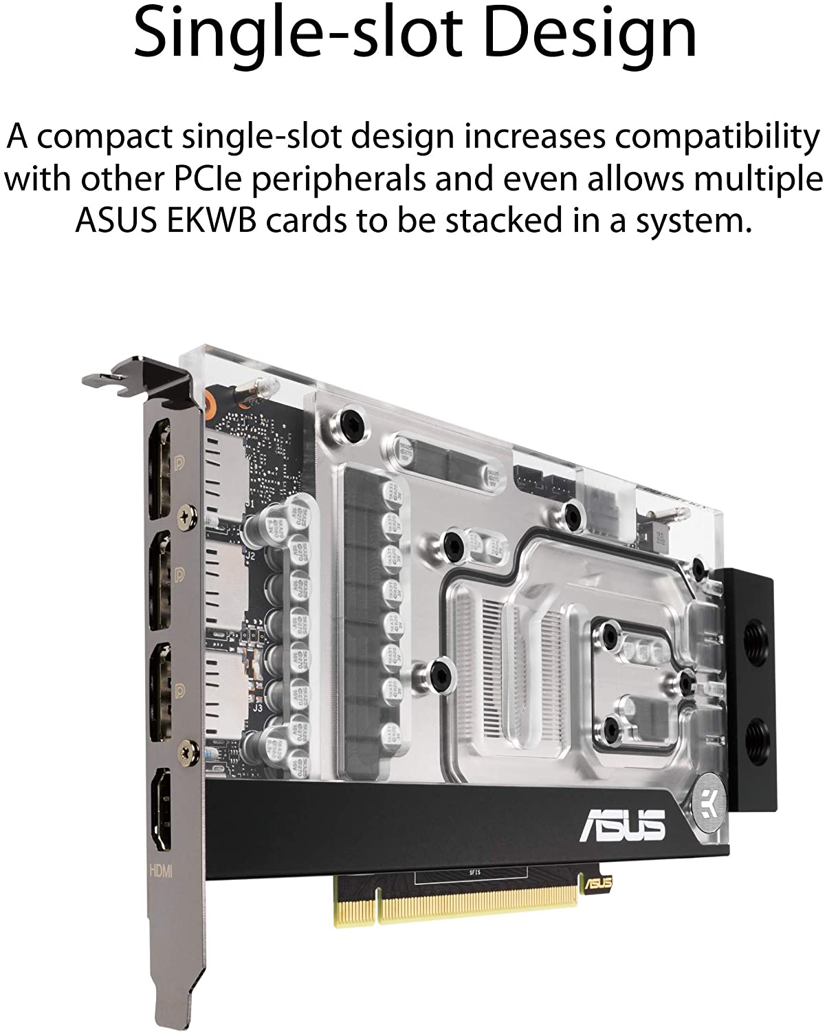 A compact single-slot design increases compatibility with other PCIe peripherals and even allows multiple ASUS EKWB cards to be stacked in a system.