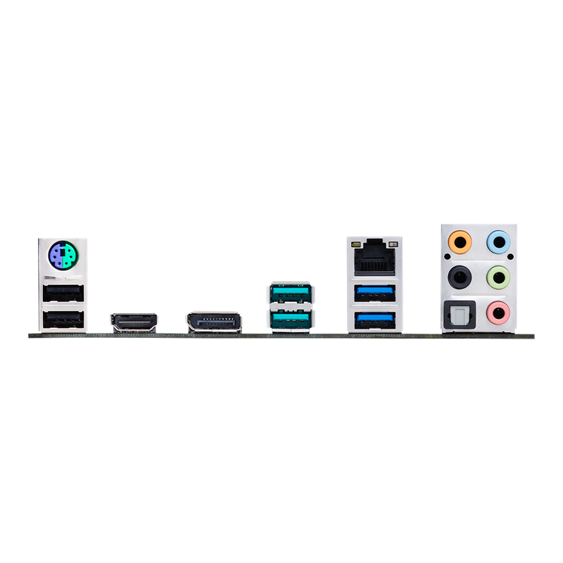 | Back I/O Ports | 1 x PS/2 keyboard/mouse combo port(s) 1 x DisplayPort 1 x HDMI 1 x LAN (RJ45) port(s) 2 x USB 3.2 Gen 2 Type-A 2 x USB 3.2 Gen 1 Type-A 2 x USB 2.0 1 x Optical S/PDIF out 5 x Audio jack(s) |