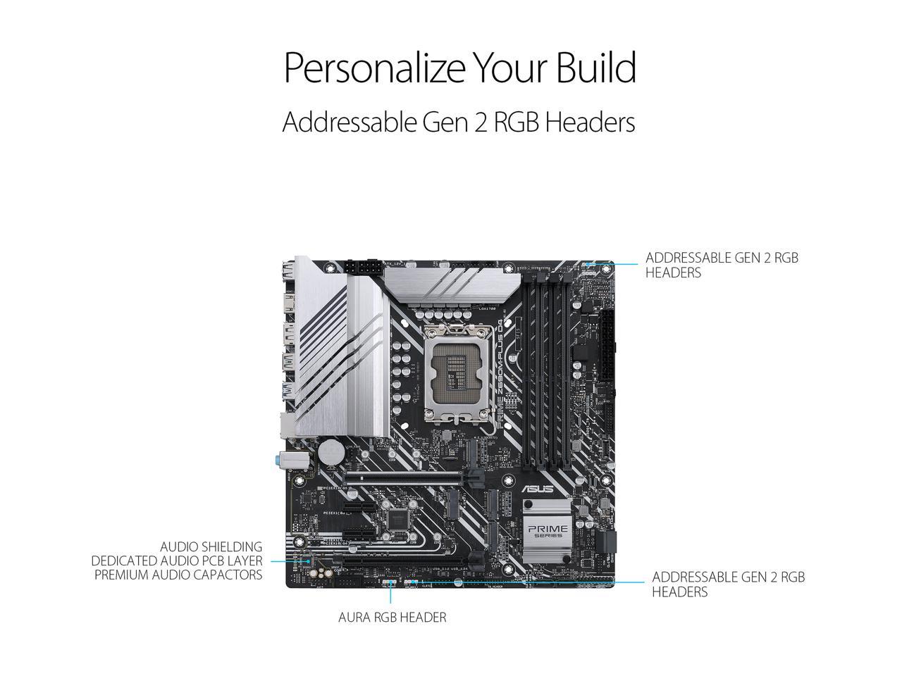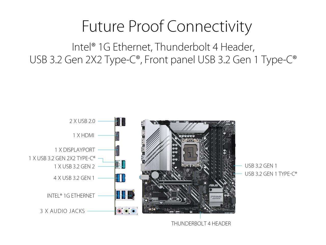 Intel? Z690 (LGA 1700) mATX motherboard with PCIe? 5.0, three M.2 slots, 10+1 DrMOS, DDR4, HDMI?, DisplayPort?? Intel? 1 Gb Ethernet, USB 3.2 Gen 2×2 Type-C?, front USB 3.2 Gen 1 Type-C?, Thunderbolt??4 header and Aura Sync RGB lighting