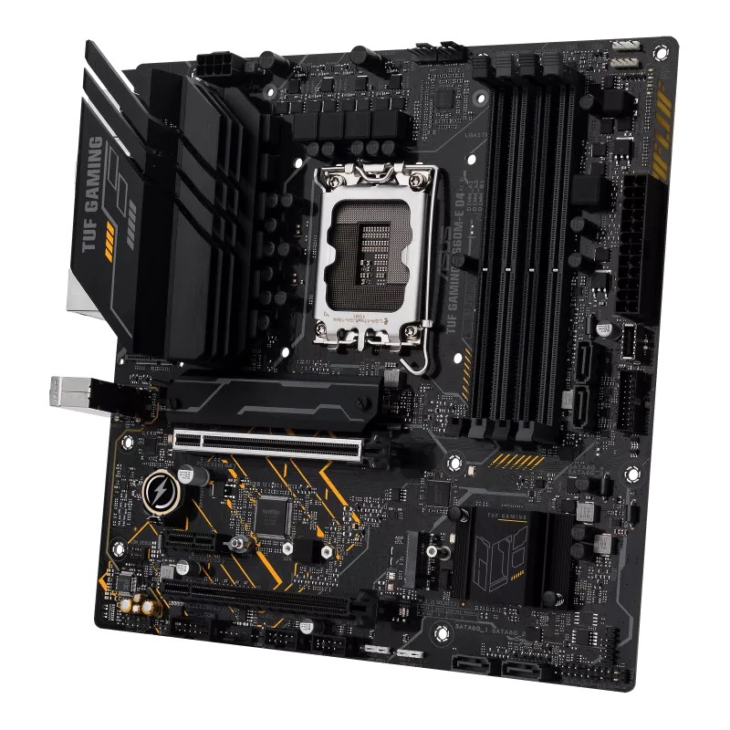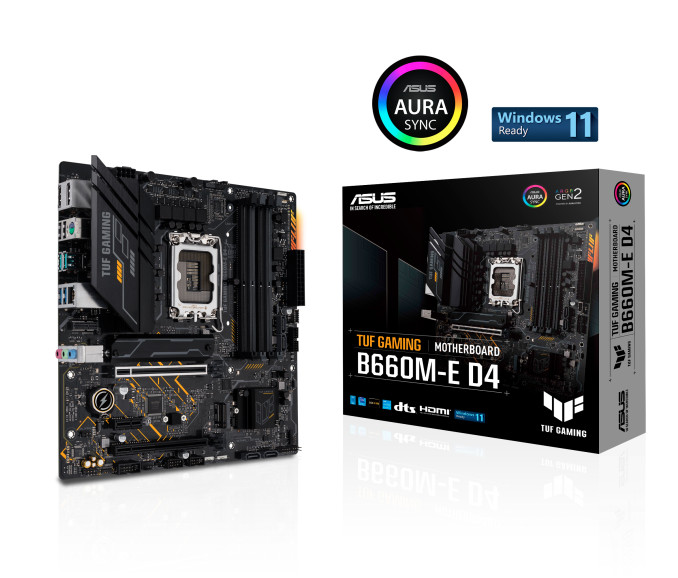 ASUS TUF GAMING B660M-E D4 takes all the essential elements of the latest Intel? processors and combines them with game-ready features and proven durability. Engineered with military-grade components, an upgraded power solution and a comprehensive cooling system, this motherboard offers rock-solid and stable performance for marathon gaming. Aesthetically, TUF GAMING B660M-E D4 sports the new TUF Gaming logo and incorporates simple geometric design elements to reflect the dependability and stability that defines the TUF Gaming series.