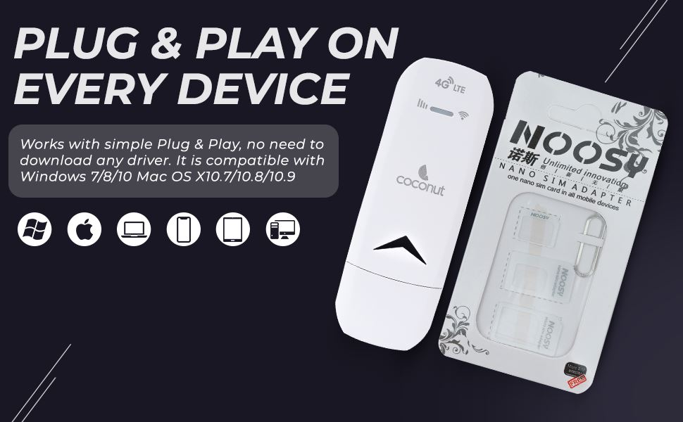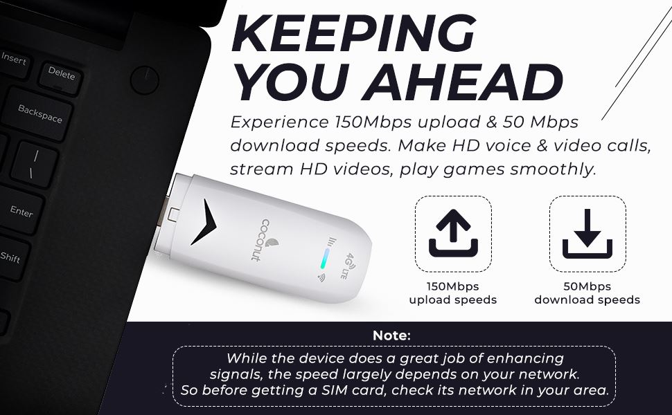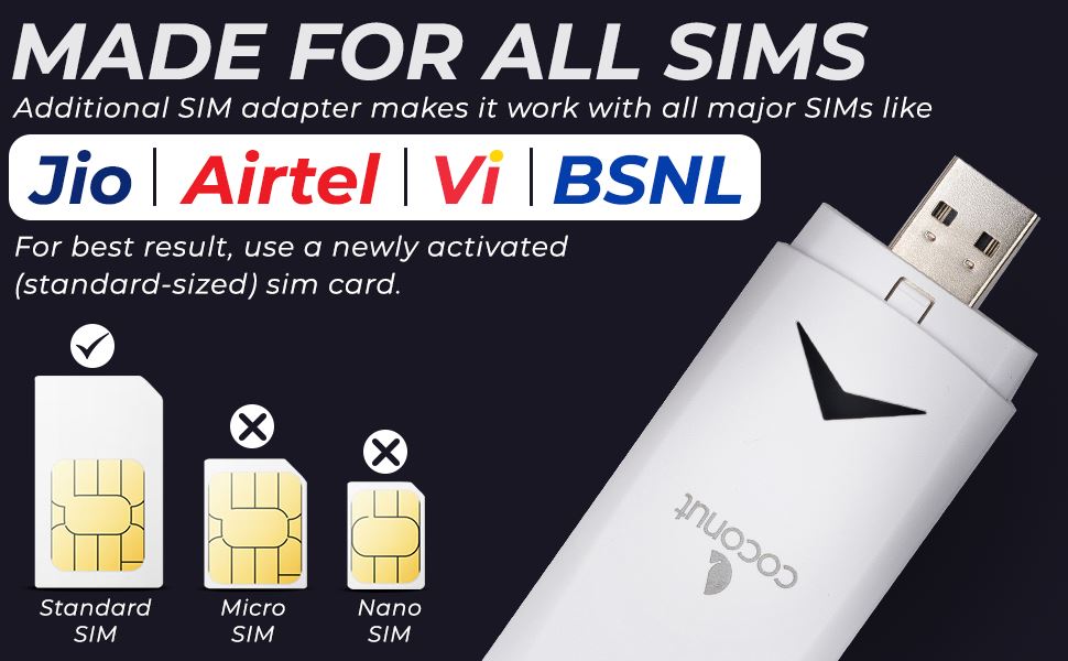 TRUE 4G SPEED : Enjoy blazing fast internet speeds with Coconut 4G dongle. Download speed upto 150 Mbps, Upload speed upto 50 Mbps. This 4G Data Card all sim support with wifi enabled makes life faster and easier. There is Storage of 4GB EMMC+512MByte DDR2 ENJOY 4G DATA SPEED ON 2G/3G DEVICES : With WUD04 4G Data Card, unlock high speed 4G data on your 2G/3G smartphones. With the WiFi Chipset : MT6625 Convert any of your SIMs into a Portable Wifi Hotspot with multi sim supported. Connect your Smartphones, Tablets, PCs and access 4g data speeds with this 4g wingle, fast 4g wi fi dongle CAN CONNECT UPTO 9 DEVICES : Coconut 4G wifi dongle can connect upto 9 devices from mobile phone to laptop to PC to Smart Tv and tablet as well and run smoothly on each of them, access 4G internet speeds on multiple devices at once and enjoy True HD video calling & HD voice calling with high speeds unlocked with our portable wifi data card. HIGH DATA SPEEDS : Experience 150mbps upload & 50mbps download speeds, depending on the network strength, allowing you to make HD Voice & Video calls, stream HD Videos, and play online games smoothly. SUPPORTS ALL INDIAN SIMs : The new 4G USB Dongle is compatible with all major SIMs of India like Airtel, Jio, Vi, BSNL etc. and works smoothly with all the SIM Cards RICH LED INDICATORS : The all new Wifi Dongle has beautifully glowing LED indicators for Signal & Wifi both SPECIAL VENTS FOR AIR FLOW : The unique design of this dongle is unbeatable, with Special Vents for Airflow & Cooling in the dongle SIM ADAPTER INCLUDED : There is a SIM Adapter in the package, for your Nano & Micro SIMs, but for best results, use a NEWLY ACTIVATED SIM Card. QUALCOMM CHIPSET FOR BETTER CONNECTIVITY : This 4G Dongle Upgraded high end Qualcomm Chipset for reduced network drops and advanced connectivity INTERNET ANYTIME, ANYWHERE : The portable design & element in in the data card, makes it super convenient and easy to carry it in your pocket or bag and access Internet Anytime, Anywhere PORTABLE : Coconut 4G wifi dongle come in a very handy size. You can carry it easily whether in a cafe, in a park, or while going on a holiday. EASY TO USE : Coconut 4G wifi dongle come very user friendly. You can simply plug it into your computer?s USB port. They allow a connection with up to 9 devices. PLUG & PLAY: PLUG & PLAY! Unbox. Remove the Back cover. Put in the SIM card. Plug into any USB Power source. You are ready to use it. PERFECT FOR EVERY SPACE : A portable wifi dongle is a perfect pick if you are on a holiday, traveling, sitting in a cafe, or in a park. It can be carried anywhere you go so that you can use the internet wherever you want. HANDY DESIGN : Coconut 4G Wifi Dongle comes in a very easy to carry design so that you can carry it everywhere for all your work-related emergencies. DEVICE COMPATIBILITY : Wireless 4G Dongle can connect up to 9 devices at a time including mobile phones, TV, tablets, Smart TV and computer.
