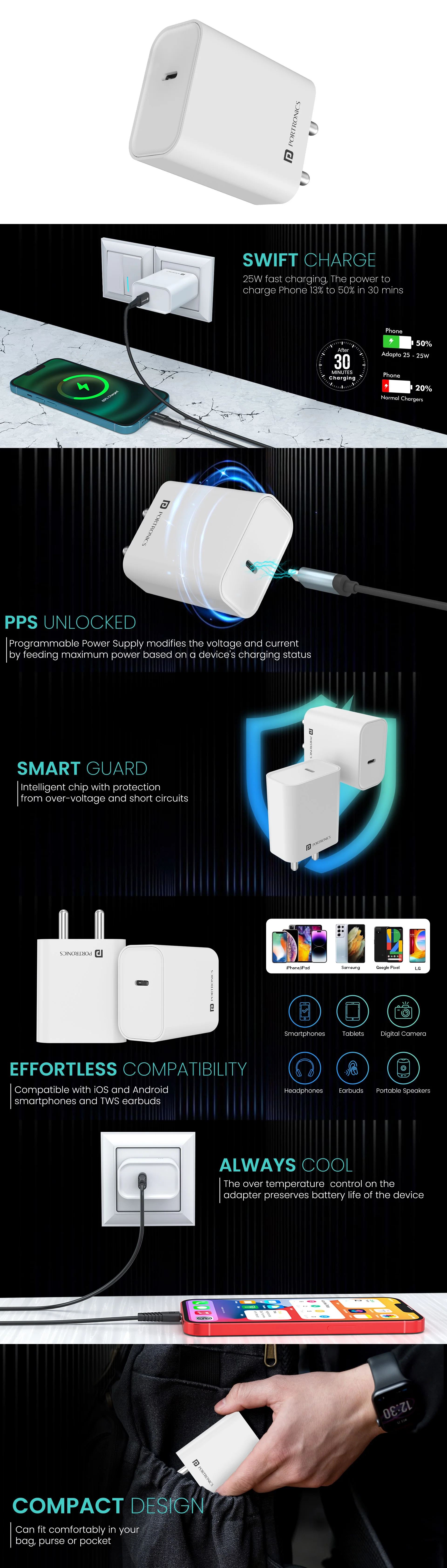 Features 25W Fast Charging Power: Say goodbye to slow charging times. With a powerful 25W output, this charger is perfect for quickly replenishing your devices’ battery life, so you can stay connected without delays. Type C PD Output: Equipped with the latest USB-C Power Delivery technology, this charger provides a fast and efficient charging experience. Ideal for smartphones, tablets, and other compatible devices, it ensures that you get the most out of your charging sessions. Universal Compatibility: This charger is designed to work seamlessly with a wide variety of devices. Whether you?re charging the latest smartphone, tablet, or any USB-C enabled device, you can count on this charger for reliable performance. Intelligent Chip Technology: Built with an advanced intelligent chip, this charger automatically adjusts the power output to match the requirements of your device, ensuring safe and optimised charging. The chip also provides protection against overcharging, overheating, and short circuits. BIS Certified: Safety is our top priority. This charger is BIScertified, ensuring that it meets the highest safety and quality standards. You can trust this charger to provide safe and efficient charging every time. Warranty: 6 Months Importer/Manufacturer/Packer: Portronics Digital Private Limited, Ground Floor and First Floor, Property No. D 8 Upper Basement, Sector 8, Noida, Gautam Buddha Nagar, Uttar Pradesh, 201301