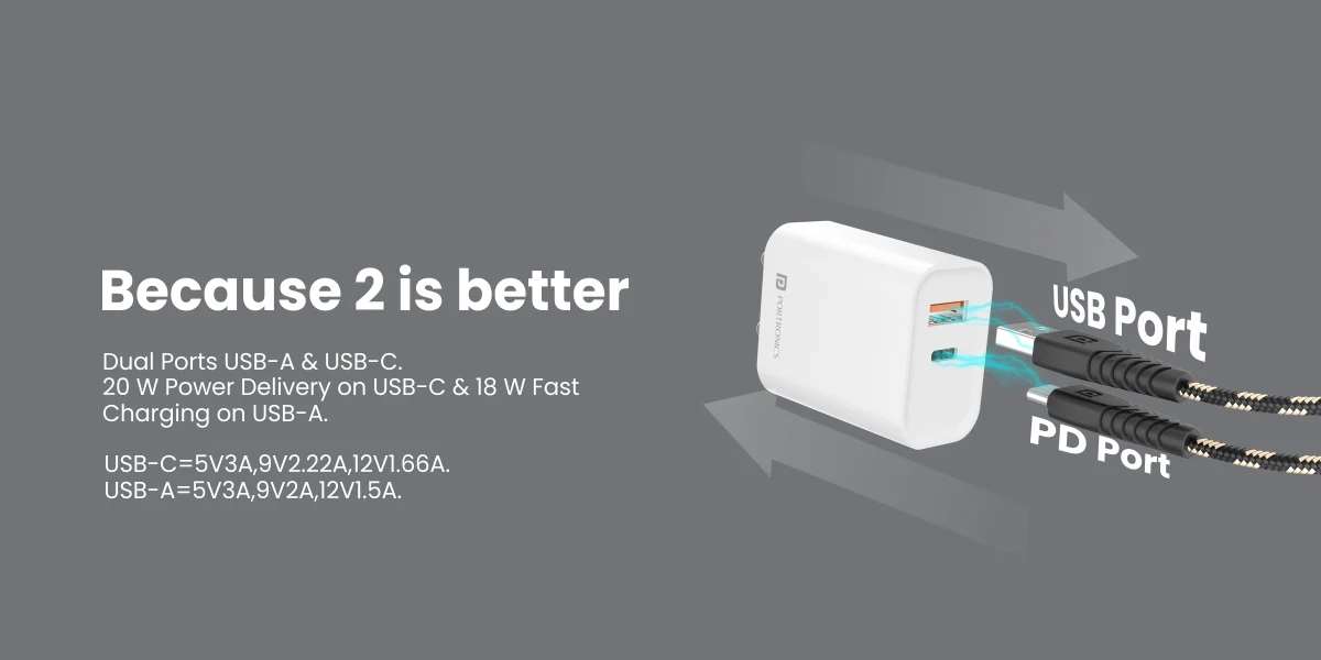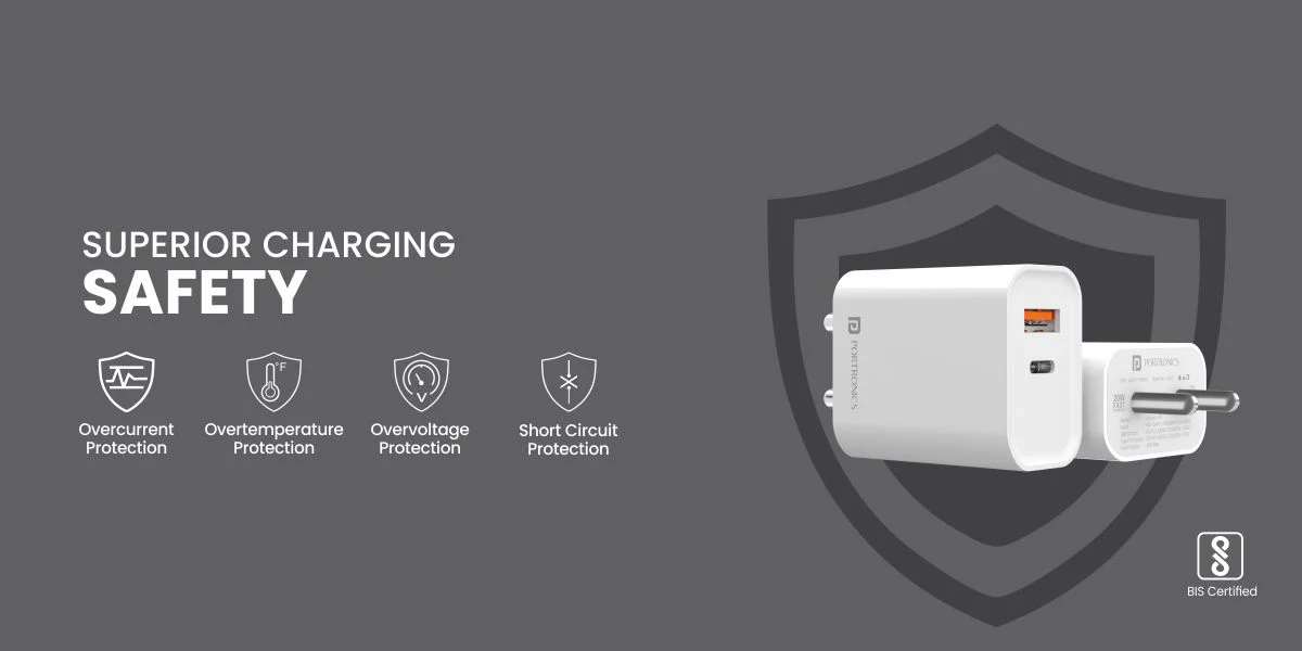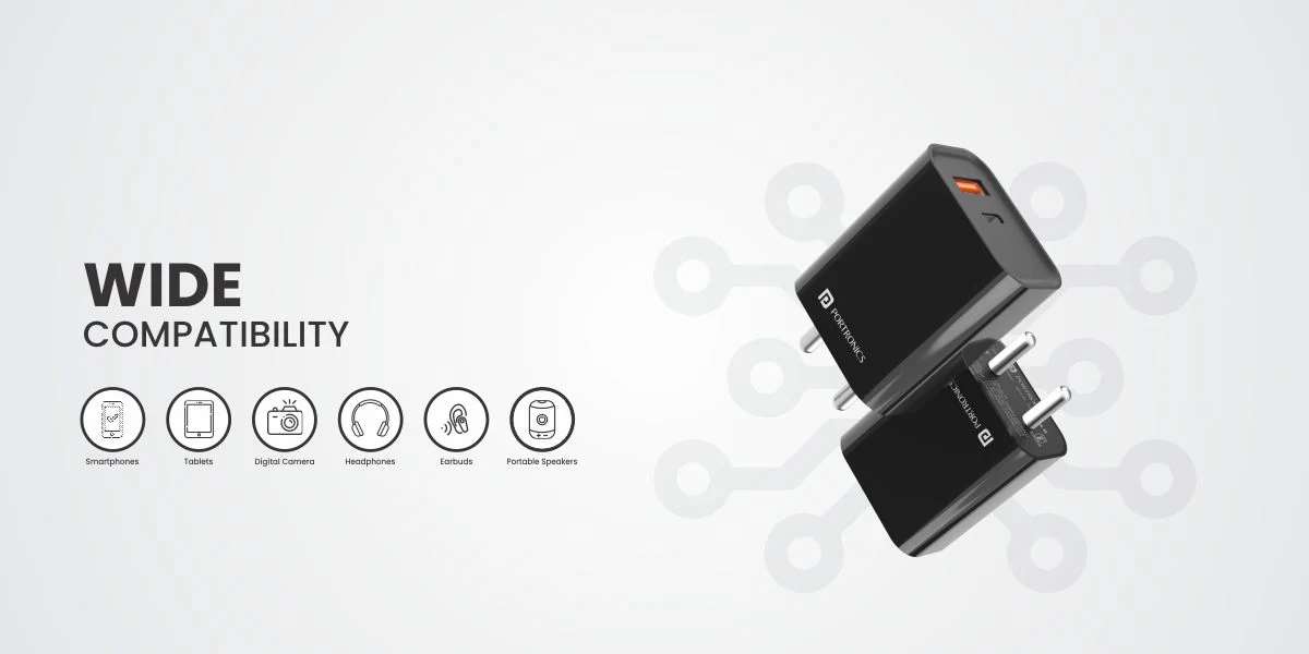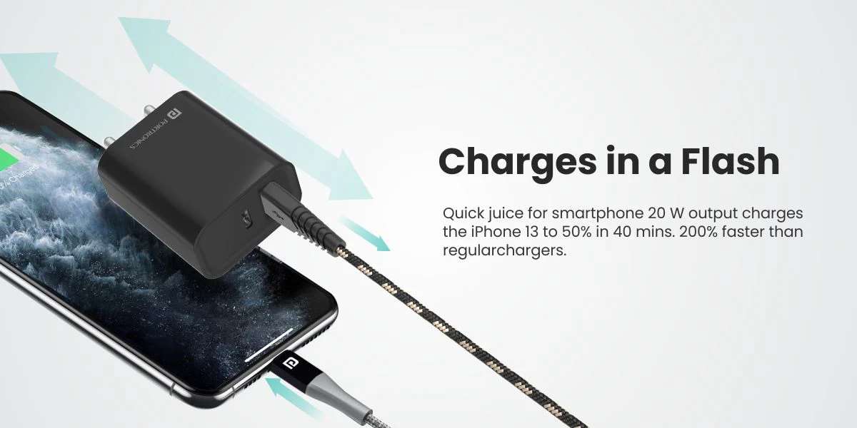 Redefined Speed charging Compatible Devices with the Fast charger – Apple: iPhone 13 Pro Max, iPhone 13 Pro, iPhone 13 mini, iPhone 13. iPhone 12 Pro Max, iPhone 12 Pro, iPhone 12 mini, iPhone 12. iPhone 11 Pro Max, iPhone 11 Pro, iPhone 11. iPhone SE 2. Samsung: Samsung Galaxy S22, Galaxy S21, Galaxy S21 Plus, Galaxy S20 Ultra, Galaxy S10, Galaxy S10 Plus, Galaxy S10e, Galaxy S9, Galaxy S9 Plus, Galaxy S8 & Galaxy S8 Plus. Google: Pixel Pixel 6, Pixel 6 Pro, Pixel 5, Pixel 4A, Pixel 3a, Pixel 3XL, Pixel 3, Pixel 2 X and Pixel 2 OnePlus: 6, 6T, 6Pro, 7, 7T, 7Pro, 8, 8T & 8pro. Duplex Charging: The Adapto 45 20 W fast charger comes with dual ports to act as your smartphone’s charging duplex. USB A-type and C-type ports with a 20 W total output. When connected with a single device the power adapter provides an output of 20 W PD fast charging with the following outputs USB-C=5V3A,9V2.22A,12V1.66A. When using a singular device with USB-A it provides 18-watt fast charging with the following output USB-A=5V3A,9V2A,12V1.5A. While using multiple devices the fast charger supplies a 15.5-watt output to the two ports.USB-A+C=5V3.1A(15.5MAX) where fast charging is not supported simultaneously. Accelerate your Charging: Juicing up devices just got a whole lot faster with Adapto 45 fast charger adapter as it supports quick charging. It can charge the iPhone 13 to 50% in 40 mins. It makes the power adapter 200% faster than a standard 10-watt charger It can charge the iPad mini and Air in 2.5 hours. It can charge the Galaxy tablet S8 to 50% in 70 mins. Travel light: Pocketable power always with mobile charger Adapto 45 as the 20 w USB C power adapter weighs 58 grams and fits just about anywhere bag or purse with a dimension of 53mm x 45mm x 28mm. Safe Charging: The fast charger has an integrated chip that prevents over-voltage, over-temperature and short circuits. Now you can get fast charging for multiple devices to ensure safety. Importer/Manufacturer/Packer: Portronics Digital Private Limited, Ground Floor and First Floor, Property No. D 8 Upper Basement, Sector 8, Noida, Gautam Buddha Nagar, Uttar Pradesh, 201301