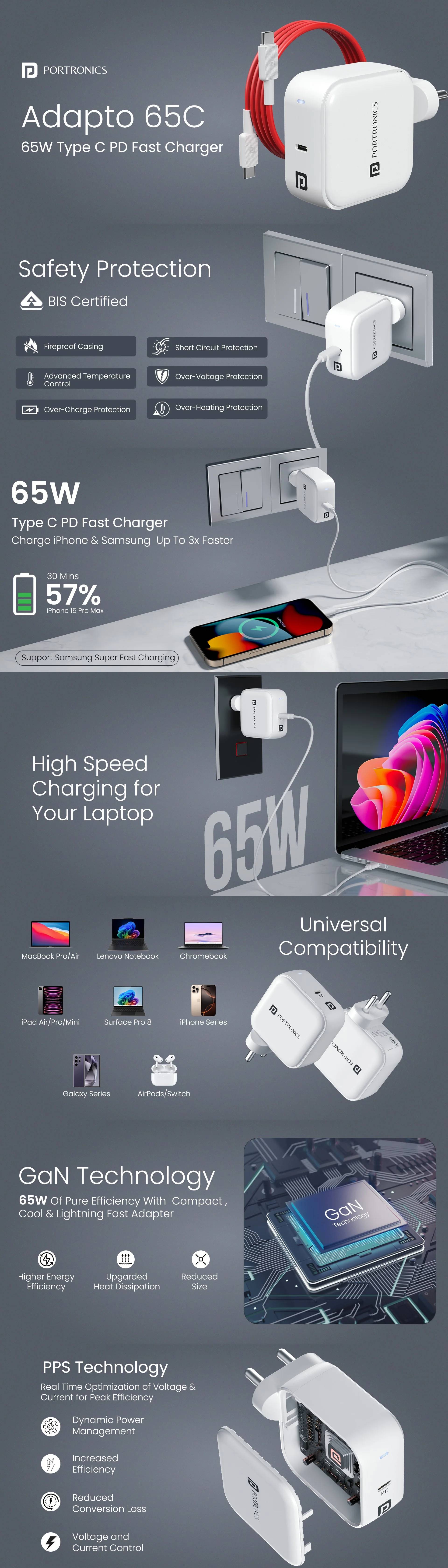 Portronics Adapto 65C 65W Type C PD Super Fast Charger Adaptor for Laptop, Smartphone, iPads & Tablets, GaN Technology, Best for Samsung, iPhone, Nothing, iPads, MacBook, Type C Laptop(White)