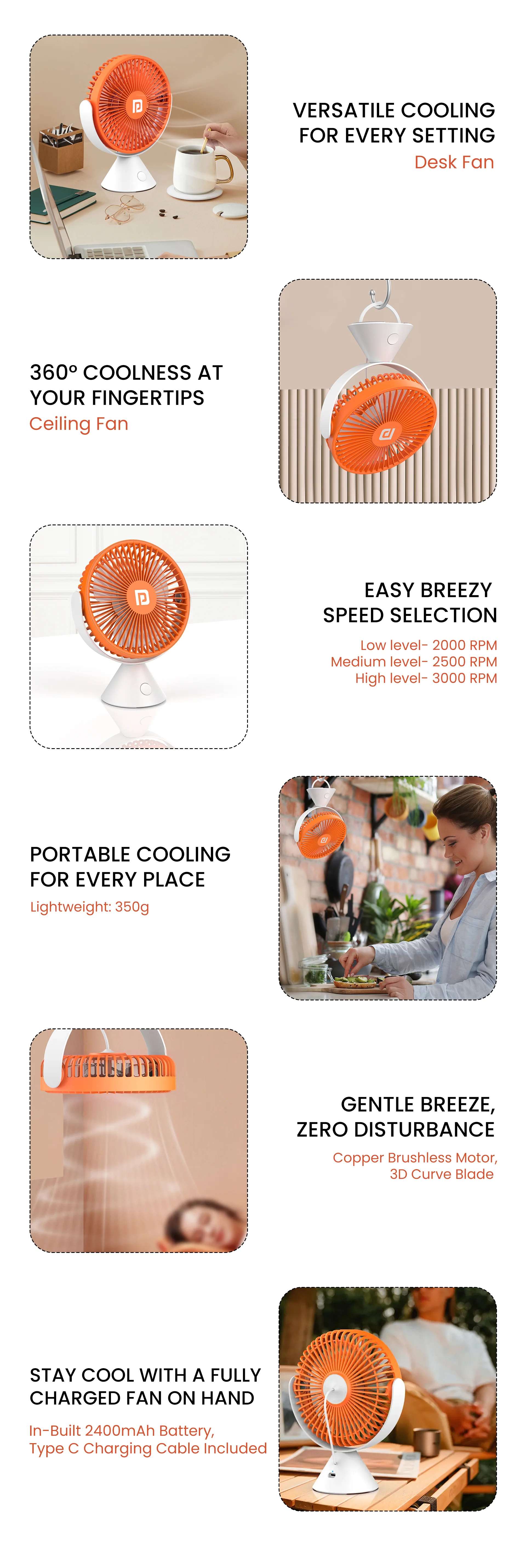 Features: Portable Desktop Fan: Aero Breeze by Portronics is a lightweight (350g) and portable fan that provides powerful and flexible cooling. Conveniently place it on your desk or hang it on the ceiling for practical, on-the-go comfort. 3 Adjustable Speed Levels: Enjoy max comfort with our portable table fan featuring 3 adjustable speed levels ? Low (up to 8 hours), Medium (up to 4 hours), and High (up to 2.5 hours). Simply press the Power button to choose the desired speed. Versatile Cooling Anywhere: This portable table fan is perfect for various settings – Hang it in the kitchen while cooking, place it on your desk during work, set it by your bedside for a peaceful sleep, or enjoy a breeze during camping, picnics, and more. Up to 3000 RPM: Enjoy a cool and refreshing experience with our portable desk fan delivering an impressive airflow of up to 5000 RPM depending on fan speed levels (Low level- 2000, Medium level- 2500, High level- 3000) 360-Degree Cooling: Experience ultimate flexibility with the portable table fan?s full 360-degree rotation capability. Whether you’re working, relaxing, or sleeping, enjoy a customized and refreshing breeze from any direction. 2400mAh Rechargeable Battery: With 2400mAh rechargeable battery, enjoy the cool breeze for a long time. Use the included Type C cable for convenient charging. Charge for 2 hours before first use. Noiseless Cooling: Features a Copper Brushless Motor and 3D Curve Blade design for efficient and silent cooling. It is an ideal companion for work, relaxation, or sleep. Enjoy the whisper-quiet comfort. Environmentally Friendly Design: Crafted from environmentally friendly ABS, the Aero Breeze is the perfect balance of functionality and sustainability. Wear this portable neck fan without worry. Warranty: 12 Months Importer/Manufacturer/Packer: Portronics Digital Private Limited, Ground Floor and First Floor, Property No. D 8 Upper Basement, Sector 8, Noida, Gautam Buddha Nagar, Uttar Pradesh, 201301