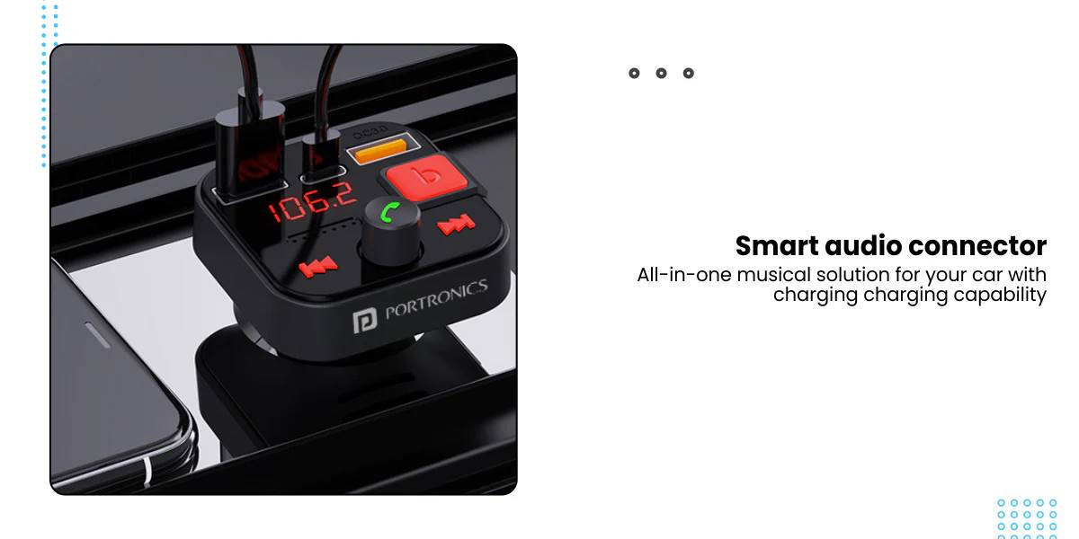 Portronics Auto 20 Smart Audio Connector with Mobile Charger (Type C + QC 3.0)/ Latest Bluetooth 5.1/ 30W Output/ Handsfree Calling/ Powerful Bass Compatible with Most Cars (Black)