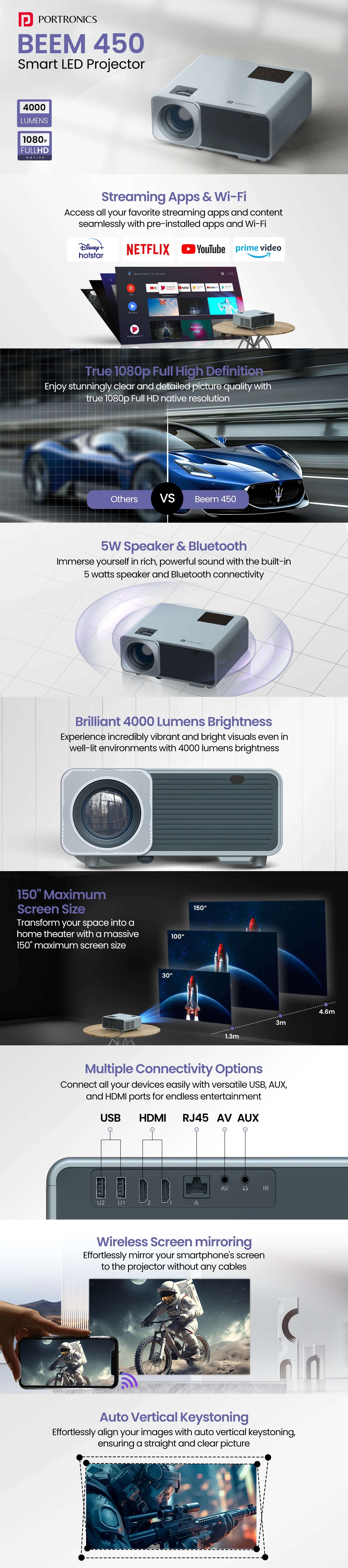 Smart LED Projector: Portronics Beem 450 is a smart LED projector. Crafted with precision, this portable projector?? stunning visuals and better than ever user interface will take your home theater experience to a whole new level.