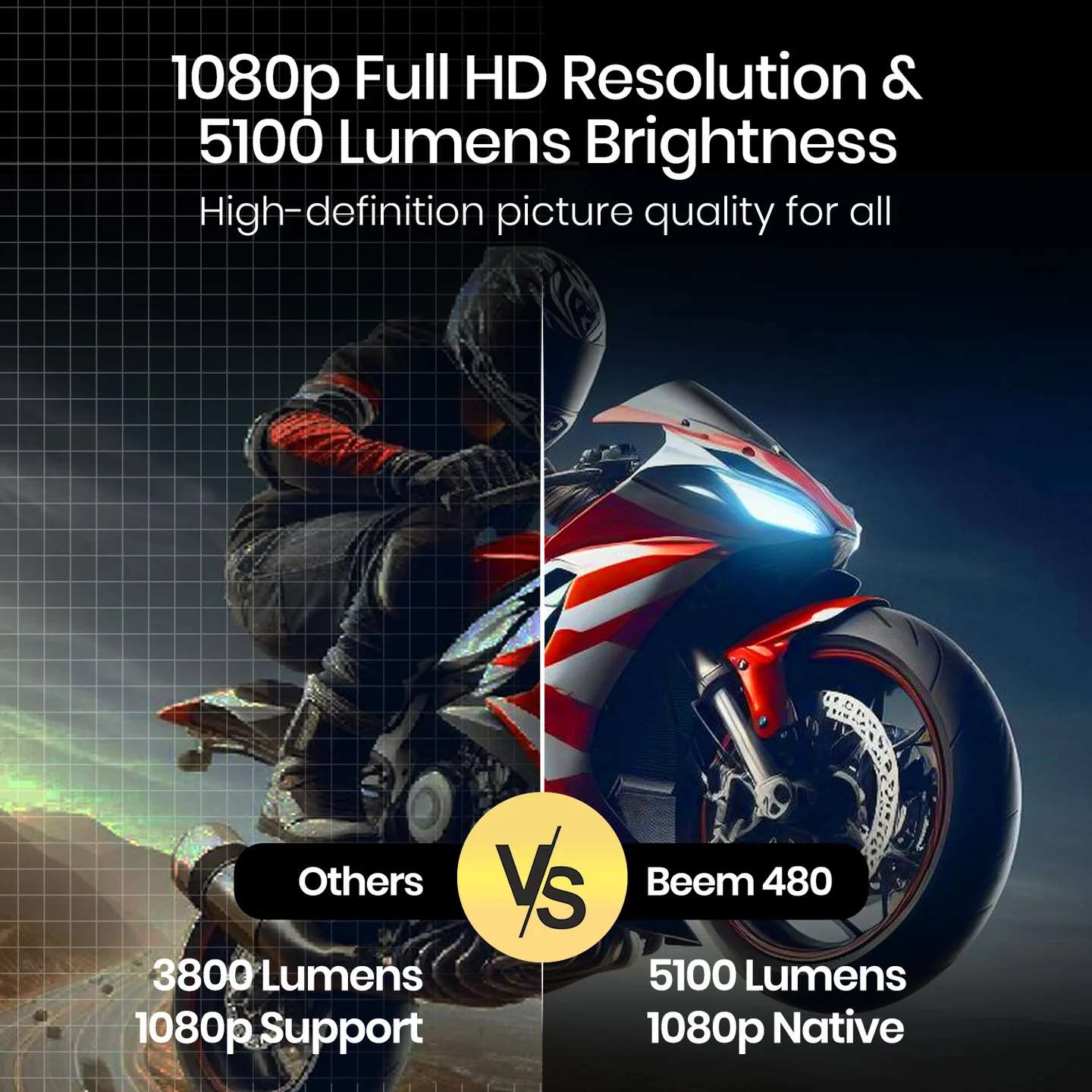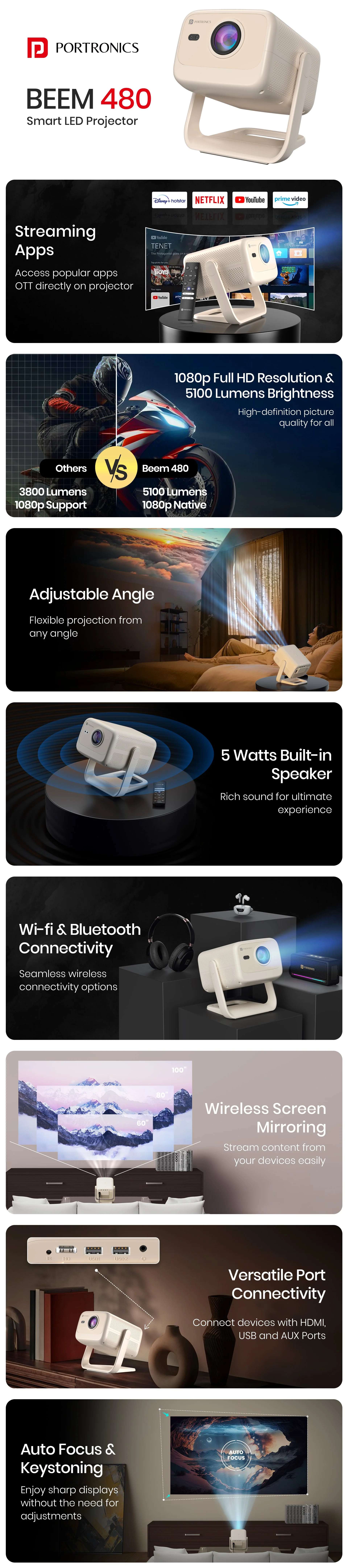 Features Smart LED Projector: Portronics Beem 480 is a smart LED projector. Crafted with precision, this portable projector?? stunning visuals and better than ever user interface will take your home theater experience to a whole new level. Streaming Your Entertainment: It comes with Android 9-based OS, for direct access to a wide range of streaming services. Now seamlessly watch content from popular OTT platforms like – Netflix, Prime Video, Disney+ Hotstar, YouTube, and more. Bright and Sharp Visuals: The projector?? 1080p Full HD resolution and 5100 lumens brightness, ensure that your movies, shows, sports, etc. are always displayed in high-definition quality and impressive brightness, even in well-lit spaces. Auto Keystone Correction: Beem 480 adopts automatic vertical correction and auto focus for distortion free images every time. Make precise screen adjustments without needing to reposition the projector. Adjustable Screen Size: This projector for home has an adjustable screen size from 36 inches to 150 inches with a projection distance ranging between 1 m to 3.8 m. Enjoy your movies, and games on a grand screen size. Warranty: 12 Months Importer/Manufacturer/Packer: Portronics Digital Private Limited, Ground Floor and First Floor, Property No. D 8 Upper Basement, Sector 8, Noida, Gautam Buddha Nagar, Uttar Pradesh, 201301