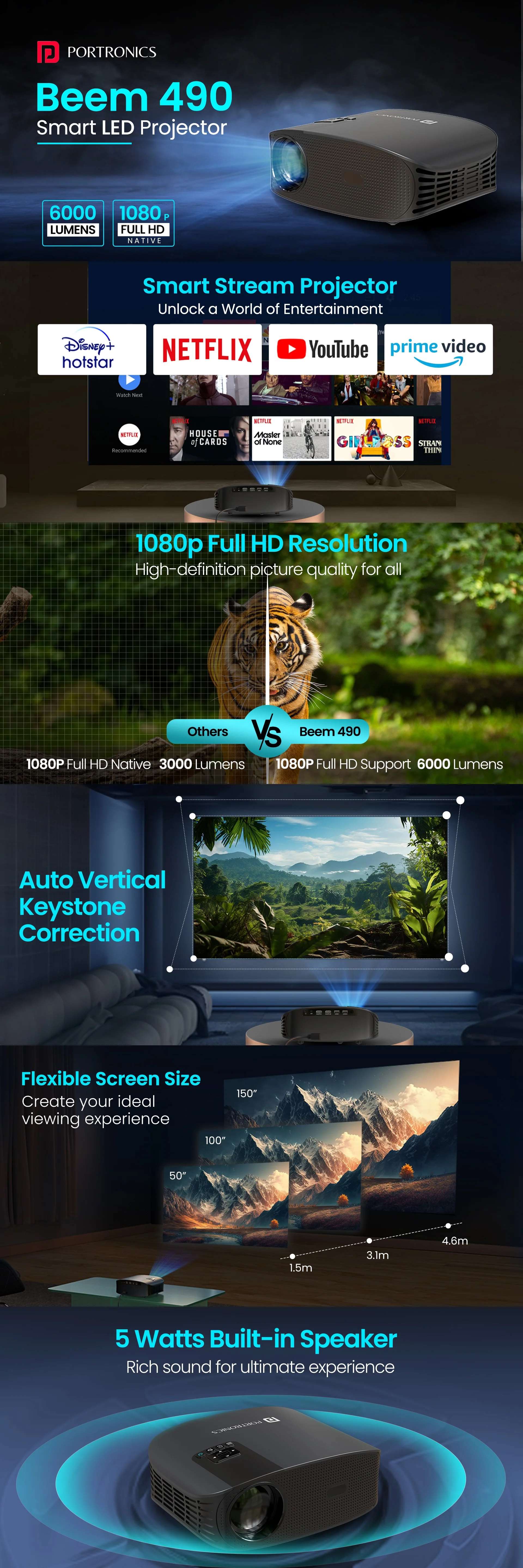 Portronics Beem 490 Smart LED Projector with 1080p Full HD, Streaming Apps (Netflix, Prime Video, Hotstar), Automatic Focus, Auto Keystone Correction, 6000 Lumens, Bluetooth, Wi-fi, 5W Speaker (Grey)