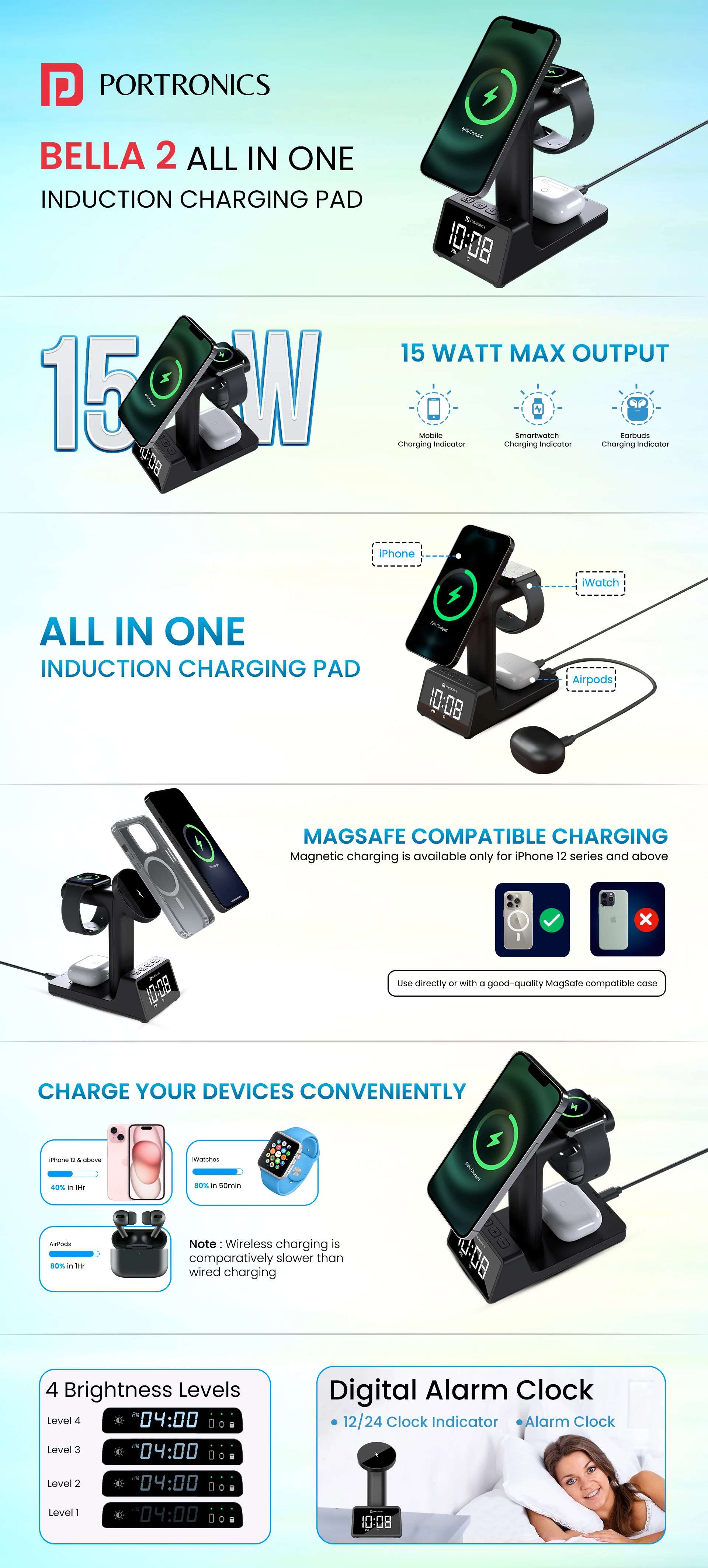 Revolutionize Your Charging Experience All-New 3-in-1 MagSafe Wireless Charger with Built-In Alarm: Charge your Qi-compatible iPhones, iWatches, and AirPods wirelessly, all while keeping track of time with the built-in digital alarm clock. Digital Alarm Clock: This isn’t just a charger, it’s a clock too! Choose between a 12-hour or 24-hour display and enjoy the convenience of a snooze button. Built-in battery ensures your alarm settings are always saved, even during power cuts. 4 Display Brightness Level: 4-level brightness control lets you personalize your experience for optimal comfort. Dim the LED clock for a restful night’s sleep or a distraction-free workspace, all while staying on track. Power Up Fast: This 3-in-1 charger keeps your nightstand tidy & devices juiced. Bella 2 intelligently adjusts charging power for iPhone 12 & above (40% in 1h), Apple iWatches (80% in 50m), AirPods (80% in 1h). One Charger for All: Bella 2 is compatible with a wide range of Qi-enabled devices. It works with your favorite devices, from iPhones and Apple Watches to AirPods and more Convenient Design: This portable 3-in-1 wireless charger keeps your space tidy and devices powered. Charge your iPhone, Apple Watch, and AirPods wirelessly. It also features a 5W USB port for charging additional earbuds. Warranty: 12 Months (1 Year) Importer/Manufacturer/Packer: Portronics Digital Private Limited, Ground Floor and First Floor, Property No. D 8 Upper Basement, Sector 8, Noida, Gautam Buddha Nagar, Uttar Pradesh, 201301