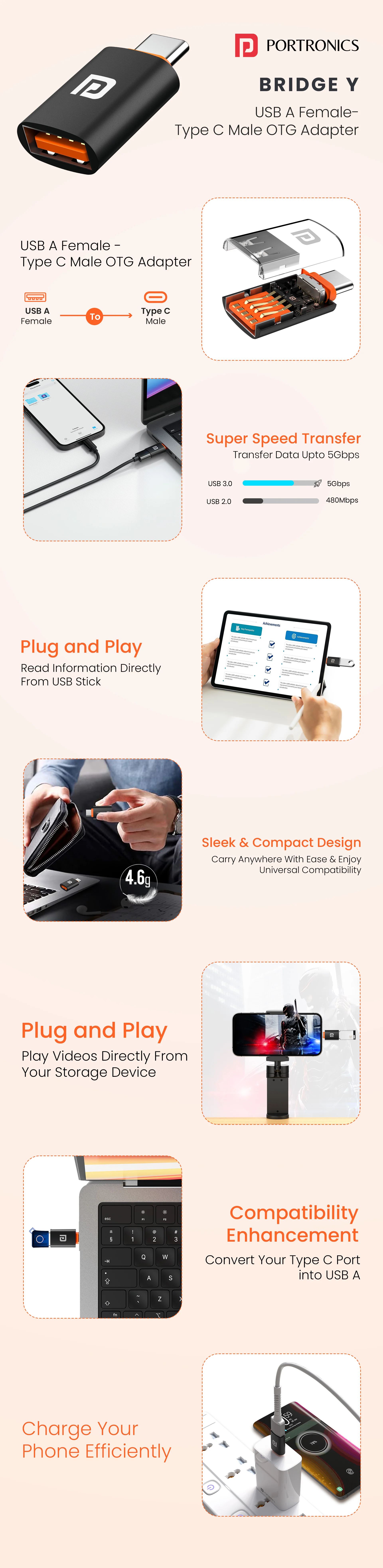 Features OTG (On-the-Go) Functionality: Transform your Type C mobile device into a host computer. Effortlessly connect devices such as keyboards, mice, gaming controllers, USB flash drives etc. Fast Charge & Data Sync: Experience rapid charging and high-speed data transfer with the BridgeY adapter. It ensures your devices are powered and synced efficiently for enhanced connectivity. Sleek & Compact Design: The Portronics BridgeY adapter?? minimalist and portable design is perfect for travel. It fits easily into your pocket or bag, making it highly convenient for on-the-go use. Wide Compatibility: This versatile adapter connects USB A devices to Type C ports and vice versa. It supports a broad range of devices, offering flexibility for various setups and usage scenarios. Aluminum Alloy Housing: Constructed with robust aluminum alloy, the BridgeY adapter features a sleek, premium look. It combines durability and style, ensuring long-lasting performance and a modern appearance. Enhanced Durability: The aluminum alloy construction provides exceptional durability. This adapter withstands daily wear and tear, making it a reliable choice for consistent connectivity needs. Efficient Data Transfer: Designed for seamless connection and syncing, the adapter supports quick and efficient data transfer between devices. Enhance your productivity with swift file exchanges and reliable connections. Warranty: 6 Months Importer/Manufacturer/Packer: Portronics Digital Private Limited, Ground Floor and First Floor, Property No. D 8 Upper Basement, Sector 8, Noida, Gautam Buddha Nagar, Uttar Pradesh, 201301