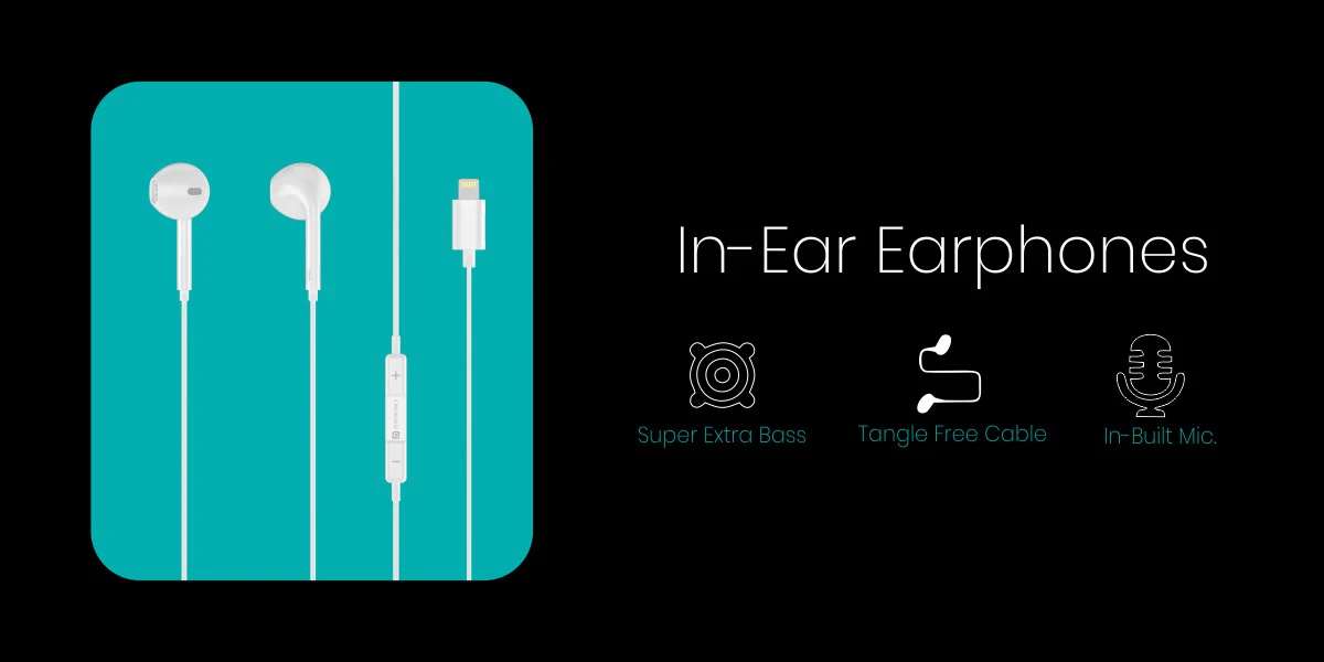 Portronics Conch 40 in-Ear Wired Earphone with 8-Pin Charging Port, Powerful Audio, Built-in Microphone, Tangle Resistant Cable – White