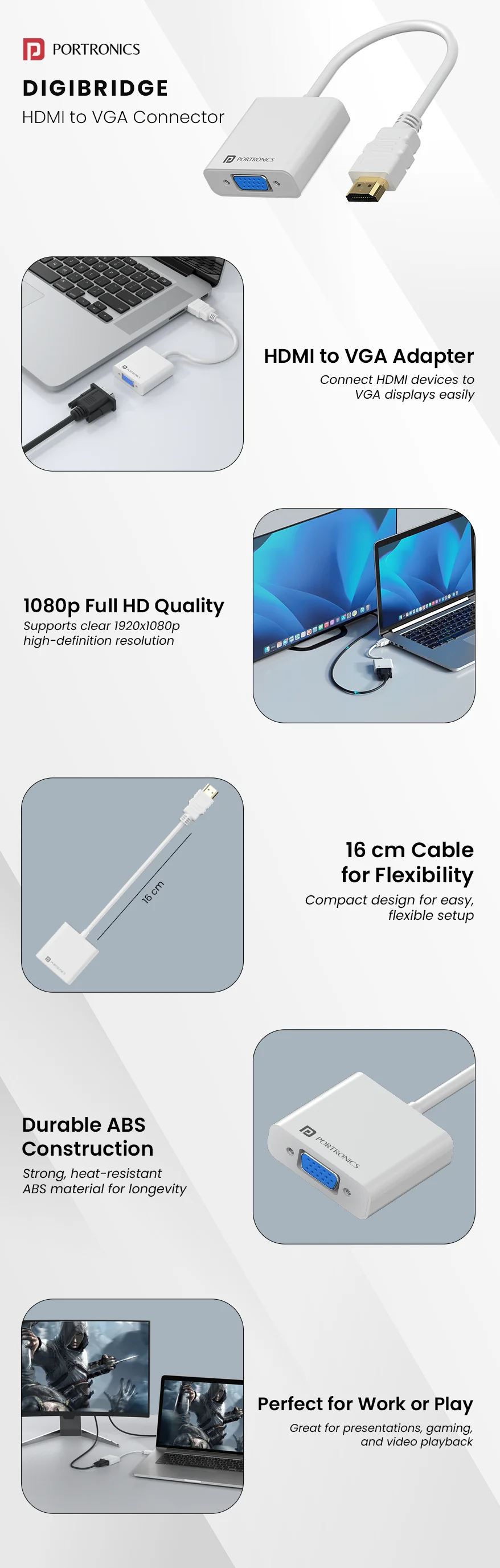 Features 1080p Full HD Support: Experience stunning visuals with upto 1080p resolution with Portronics DigiBridge, ensuring clear and vibrant images for all your presentations and media playback. Perfect for Work & Play: Whether you?re giving a business presentation or enjoying gaming and videos, this adapter is ideal for all your HDMI to VGA conversion needs. Wide Compatibility: Seamlessly share display of laptops & desktops to VGA displays, monitors, and projectors effortlessly. Plug-and-Play Convenience: Enjoy hassle-free usage with no need for additional drivers or power sources; simply plug it in and start using your HDMI device with a VGA display instantly. 16 cm Flexible Cable: Designed for versatility, the compact 16 cm cable allows for easy connections in tight spaces, making it perfect for home or office use without clutter. Durable ABS Build: Constructed from high-quality ABS material, this adapter is built to withstand daily wear and tear while providing excellent heat resistance for long-lasting performance. Warranty: DigiBridge comes with a 1-year manufacturer’s warranty. Importer/Manufacturer/Packer: Portronics Digital Private Limited, Ground Floor and First Floor, Property No. D 8 Upper Basement, Sector 8, Noida, Gautam Buddha Nagar, Uttar Pradesh, 201301