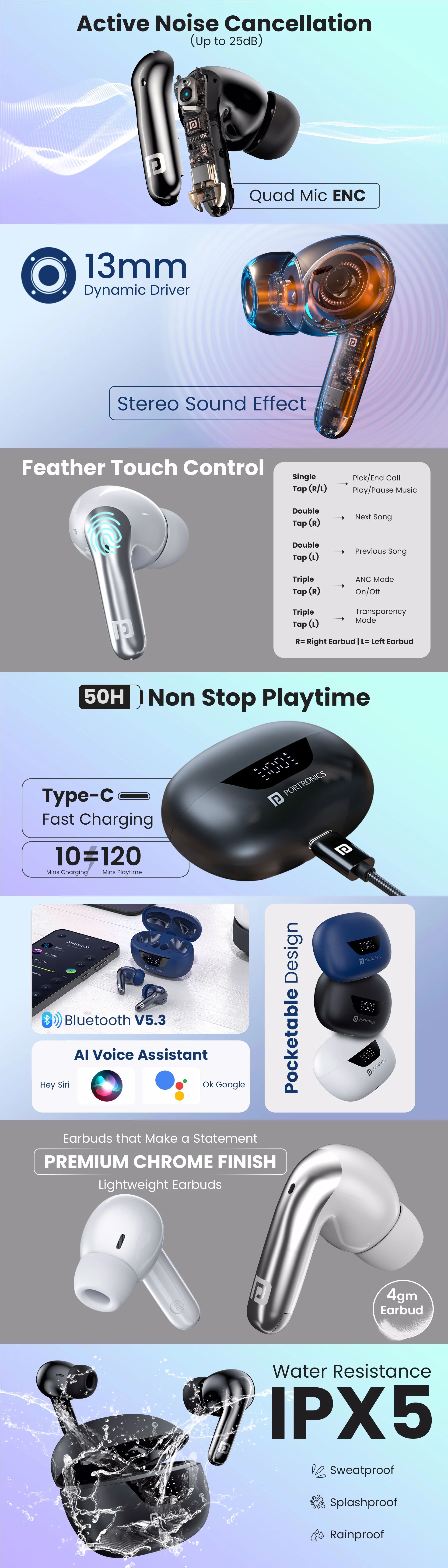 Features: ANC: Harmonics Twins S28 bluetooth earphones feature up to 25 dB Active Noise Cancellation, ensuring crystal clear audio by blocking unwanted background noise. 50-Hour Playtime: Enjoy uninterrupted entertainment for up to 50 hours. These Bluetooth 5.3v earbuds are your ideal travel companion, ensuring non-stop enjoyment. 13mm Dynamic Drivers: Equipped with powerful 13mm drivers, these wireless earbuds deliver balanced sound, enhancing your music experience with clear highs and deep bass. Low Latency: These wireless earbuds feature low latency technology, ensuring that sound matches action in real-time, perfect for gaming and immersive content without any delays. Digital Display with Type-C Charging: The charging case of these bluetooth earbuds features a dual-LED display, showing the battery status of both the earbuds and the case. Use the included Type-C cable for fast charging. Soft Touch Control: The soft-touch control feature of the gaming earbuds allows you to activate your voice assistant, manage calls, and control music playback effortlessly. IPX5; Sweatproof: Built to withstand your active lifestyle, the wireless earphones have an IPX5 rating, making them sweatproof and perfect for workouts, outdoor activities, or even rainy days. Warranty: 12 Months Importer/Manufacturer/Packer: Portronics Digital Private Limited, Ground Floor and First Floor, Property No. D 8 Upper Basement, Sector 8, Noida, Gautam Buddha Nagar, Uttar Pradesh, 201301.