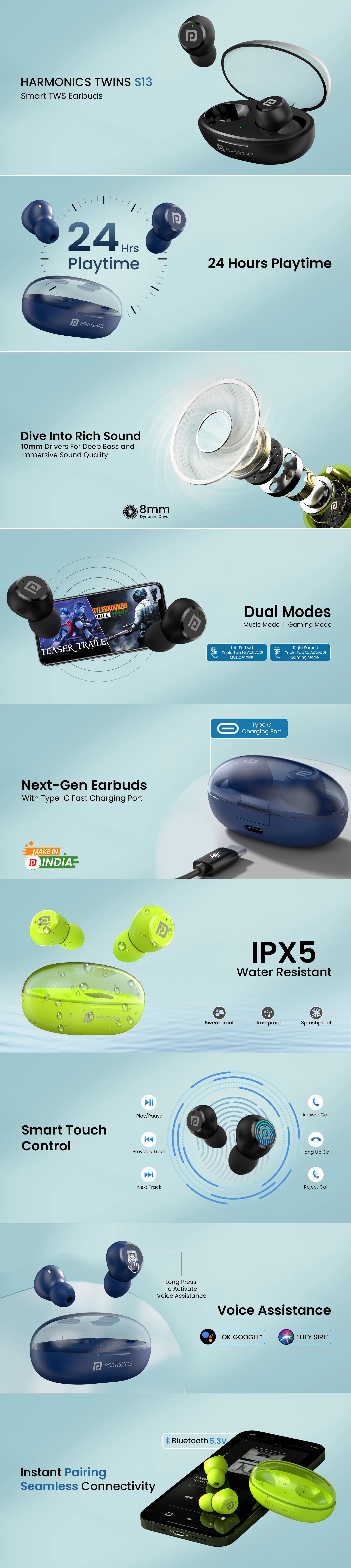 Features: 8mm Drivers: With Portronics Harmonics S13 smart TWS earbuds, dive into a world of stunning sound with 8mm audio drivers. Feel the pulse of the music, with deep bass & immersive clarity bringing every note to life. Bluetooth Connectivity: Get to enjoy true audio freedom with the latest Bluetooth v5.3 connectivity to pair wirelessly with your device for a stable connection of up to 10 meters. 24-Hour Playtime & Type C Charging: Experience uninterrupted music with our wireless earbuds, having a 24-hour playtime. Rapid charge the case using the Type C included cable. Music Mode & Gaming Mode: Switch between Music Mode & Gaming Mode on these low latency wireless earbuds, ensuring a dynamic experience for diverse content without lag. Transparent Micro Case: The earbuds bluetooth wireless has a transparent casing to give a modern look. For added convenience, they come in a pocket-sized case, which helps in carrying them easily. Comfy Fit Earbuds: These wireless earbuds are designed to provide lasting comfort throughout your day. Enjoy a comfortable fit for prolonged wear, and nail your fitness goals with these TWS earbuds. IPX5; Sweatproof and Durable: Built to withstand your active lifestyle, the wireless earphones have an IPX5 rating, making them sweatproof and perfect for workouts, outdoor activities, or even rainy days. Warranty: 12 Months Importer/Manufacturer/Packer: Portronics Digital Private Limited, Ground Floor and First Floor, Property No. D 8 Upper Basement, Sector 8, Noida, Gautam Buddha Nagar, Uttar Pradesh, 201301