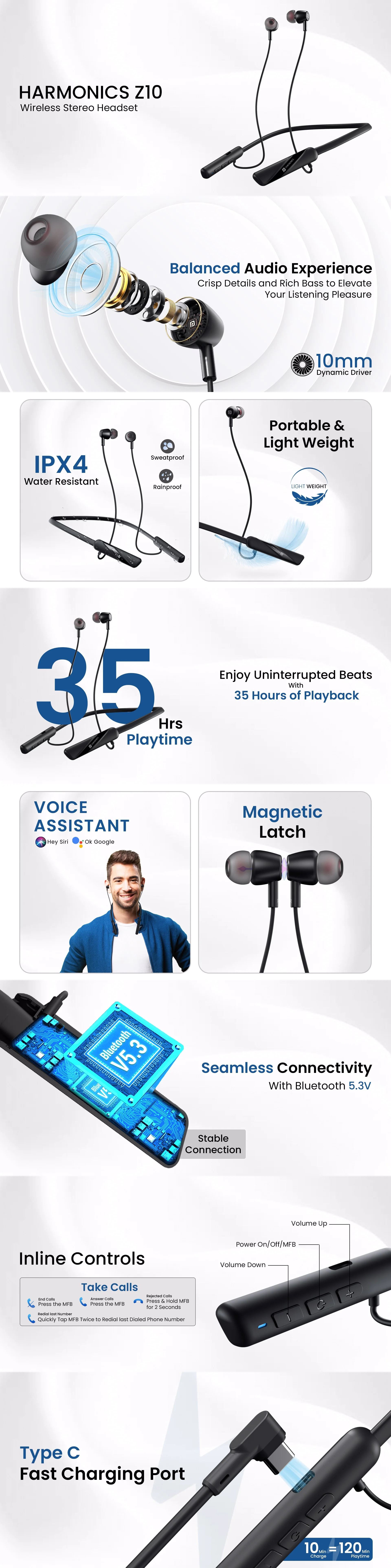 Features: 35 Hours Playback: With the Portronics Harmonics Z10 wireless stereo headset, enjoy a long playtime of 35 hours. Charging this in-ear wireless bluetooth neckband for 10 minutes will give you up to 2 hours of playback. 10mm Drivers: Large 10mm bass drivers help you enjoy your favorite beats with maximum clarity. Get immersive sound quality for listening to music, gaming, and calls along with rich bass and crisp details. Bluetooth Connectivity: Designed with the latest Bluetooth 5.3, the wireless neckband allows super-fast wireless pairing with your devices up to a range of 10m. After the first pairing, it connects automatically with your devices. In-Line Controls: The integrated controls are multi-functional. It enables hands-free calling, play, pause, next, previous, and more, and also supports voice assistants like- Google Assistant and Siri, everything at the click of a button. Water Splash and Sweat Resistant: Rated IPX4, the neckband is protected against water splashes and sweat., making them the perfect headphones for gym and other sports activities like running, etc. Rapid Type-C Charging: You can charge this bluetooth neckband using the included Type-C cable. Just connect one end of the charging cable to the Type-C port on the headset and the other end to a compatible charger. Warranty: 12 Months’ Warranty Importer/Manufacturer/Packer: Portronics Digital Private Limited, Ground Floor and First Floor, Property No. D 8 Upper Basement, Sector 8, Noida, Gautam Buddha Nagar, Uttar Pradesh, 201301