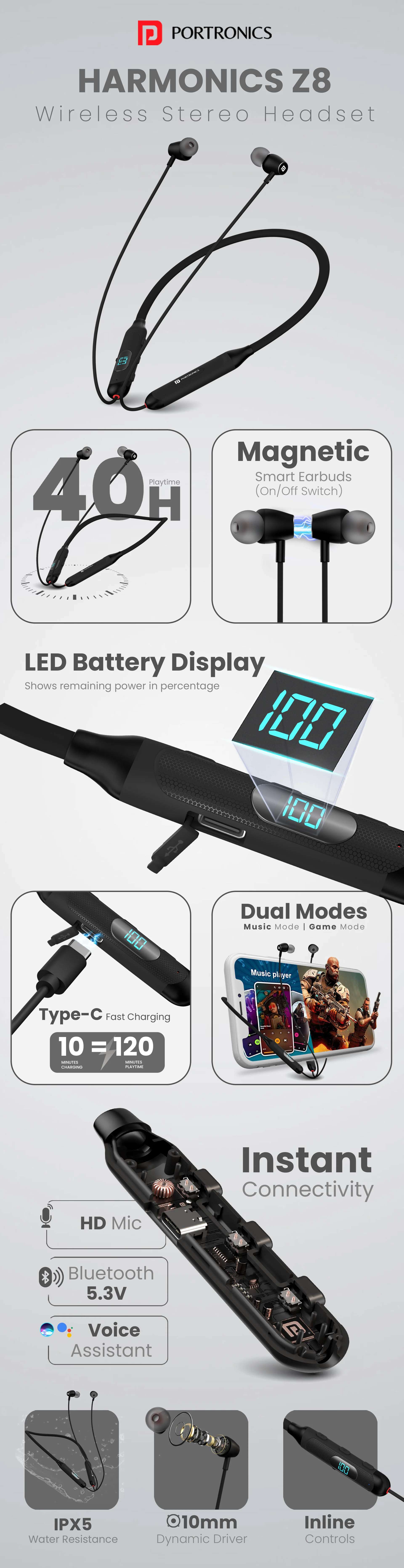 Portronics Harmonics Z8 Bluetooth Wireless Earphones with 40H Playback, Magnetic Earbuds (ON/Off), LED Battery Display, 10mm Driver, Gaming/Music Mode, IPX4 Water Resistant, Fast Charging – Black