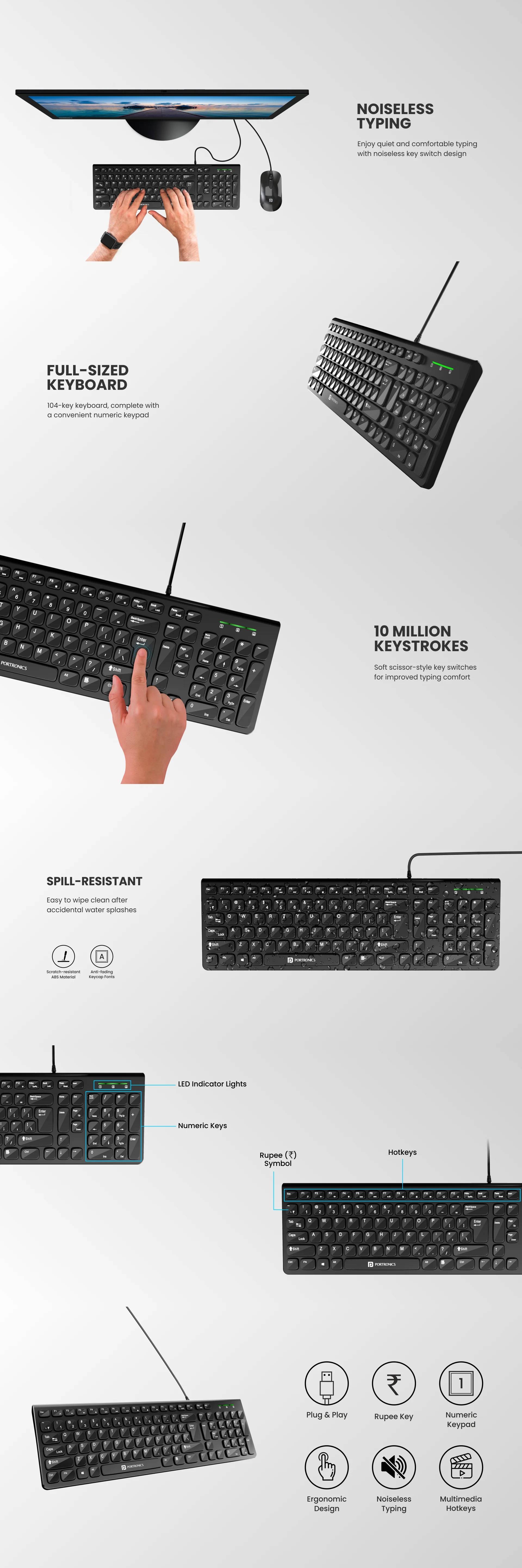 Portronics Ki-Pad 2 USB Wired Keyboard with 104 Keys/ Dual Color Chicklet Keys/ Rupee Symbol (?) Key/ Noiseless Typing/ 1.5 m Long Cable/ 10 Million Keystrokes Long Life for PC/ Laptop & USB-Supported Devices (Black)