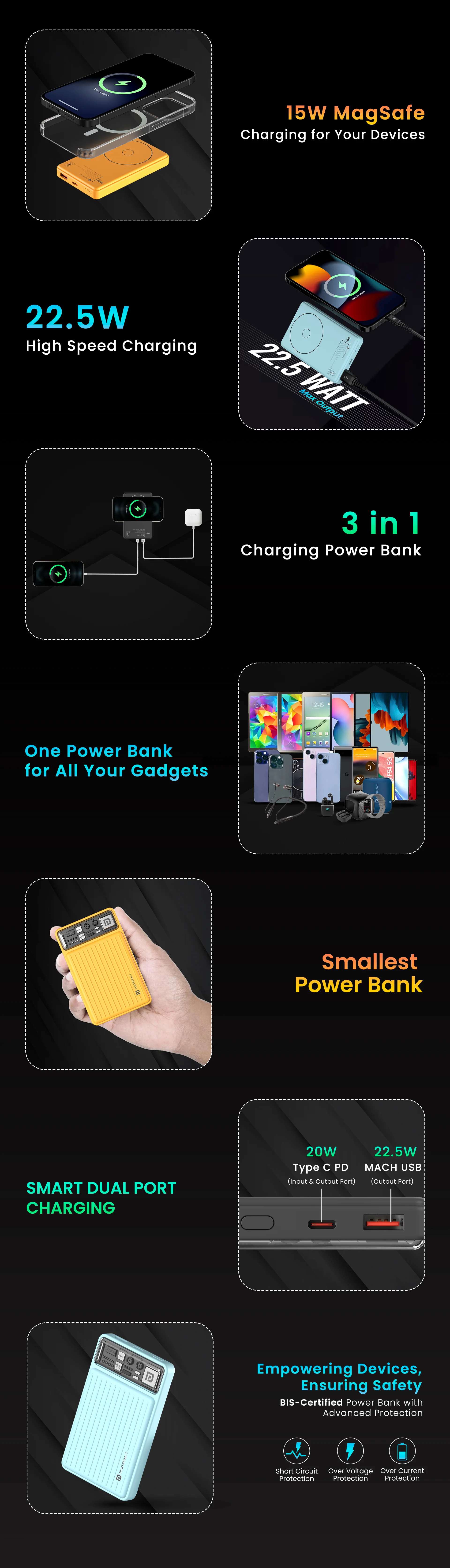 Glam Up Your Charging Routine with Luxcell Power Bank 22.5W Portable Power Bank: With a high-capacity 10,000 mAh Lithium Polymer battery, the Portronics Luxcell 10K Power Bank delivers a super-fast 22.5W max output. It ensures you never run out of battery again. Luxury Charging Solution: Glam up your charging routine with Luxcell 10 Power Bank, which combines lasting performance with stunning aesthetics. Get a complementary Type C to Type C cable as a bonus! Type-C PD and Mach USB A Ports: Charge 2 devices simultaneously with this slim power bank?? dual ports- Mach USB A (22.5W) and Type-C PD 3.0 (20 W). Type C port also works for input to charge the power bank. LED Battery Indicator: This 10000 mAh Fast charging Power bank has a transparent plastic casing with an LED battery indicator, keeping you informed about the power bank and your device?? charge. Broad Compatibility: Luxcell 10K charges Android smartphones, iPhones, tablets, speakers, and other USB-A and USB-C devices. It can charge a 3000mAh mobile phone battery up to 2.4 times and a 4000mAh battery up to 1.8 times. Sleek and Compact Design: Its ultra-compact body and fine touch finish give it a premium look. Apart from being powerful, it has a lightweight and portable design makes it easy to carry around. BIS Certified: BIS certified with advanced chip protection layers, this durable power bank ensures your devices are safeguarded against short circuits, over-temperature, and over-voltage issues. 12 months Warranty Importer/Manufacturer/Packer: Portronics Digital Private Limited, Ground Floor and First Floor, Property No. D 8 Upper Basement, Sector 8, Noida, Gautam Buddha Nagar, Uttar Pradesh, 201301