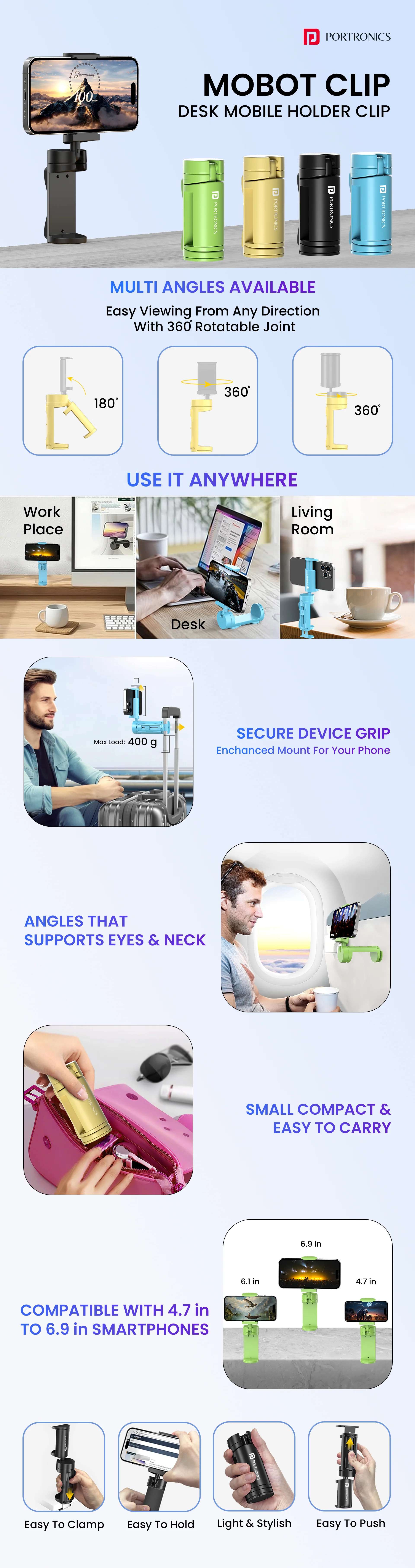 About this item: For a 360? view & support. Multiple Use Mobile Holder Clip: Keep your phone hands-free, with the Portronics, Mobot Clip a phone holder that can be used traveling by plane, working in office, cooking in the kitchen, or exercising in the gym, fix your phone for using Facetime, watching videos and more. Clip Anywhere: With a stretch of up to 1.7 inches (45mm), you can clip this mobile holder on any surface like your office desk, table, luggage, or back of a car/airplane seat. It easily clamps on, giving you comfortable phone access. Customizable Viewing Angles: Explore a wide range of viewing angles using the holder?s 360?+360?+180? rotation, and set your phone on the desired angle, keeping your neck and back in a comfortable posture. Wide Compatibility: Our phone holder can accommodate a wide range of smartphones, ranging from 4 inches to 6.4 inches. The base clip opens up to 1.77 inches (45mm), ensuring a fit for various setups like tables or other objects. Exceptional Stability: Made from premium material this desk mobile holder clip is durable and provides robust support to your devices up to 400 grams. You can rely on it to keep your phone steady and secure. Compact & Stylish: Blend style and utility with this phone mount?s foldable design, as it ensures portability while adding a touch of chic to any setting. It is compact and can be easily put in pockets, desks, or luggage. Warranty: 12 Months warranty Importer/Manufacturer/Packer: Portronics Digital Private Limited, Ground Floor and First Floor, Property No. D 8 Upper Basement, Sector 8, Noida, Gautam Buddha Nagar, Uttar Pradesh, 201301