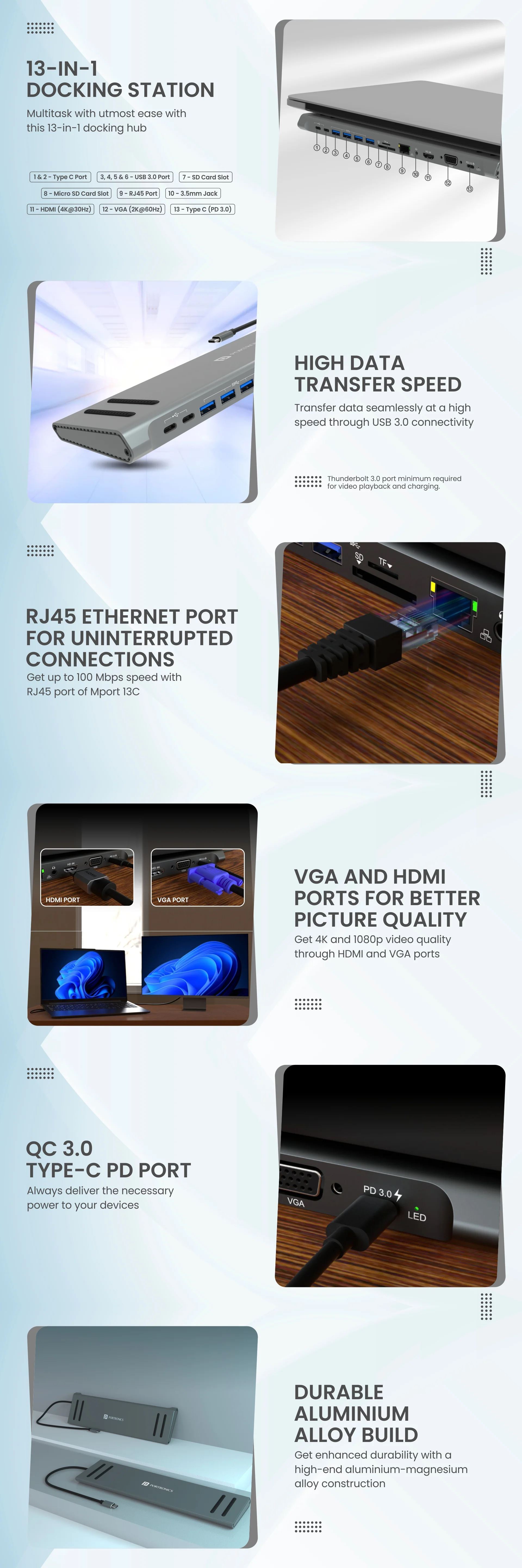 Maximum support with multiple ports – Mport 13C USB hub comes with 13 ports to give you the maximum device support possible to make working easy for you. With 4 USB 3.0 ports, 2 Type-C ports, VGA port, 1 Type-C 3.0 PD port, RJ45 Ethernet port, HDMI 4K port, SD card slot, TF card slot, 3.5mm jack, make working and multitasking easy for yourself.