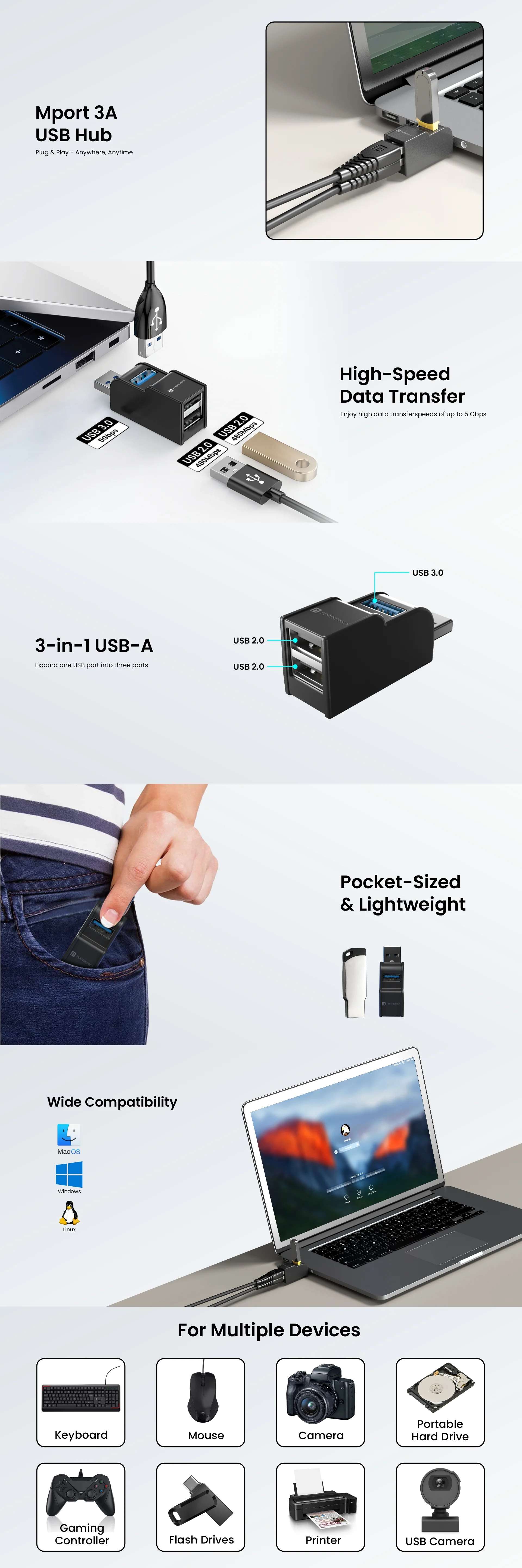 3-Port USB Hub: Fitted with 3 USB Ports allowing you to connect up to 3 devices simultaneously. The USB hub includes- 1 x USB 3.0 port and 2 x USB 2.0 ports. High-Speed Data Transfer: Enjoy the Fast Speed of 5 Gbps in the USB 3.0 Port for efficiently transferring large files within seconds. The 2 other USB 2.0 ports have a high speed of 480 Mbps which can also be used to transfer data and connect the Keyboard, Mouse, USB Flash Drives, and other devices. Wide Compatibility: The 3-port USB hub seamlessly supports a wide range of USB-enabled computers, including PCs, laptops, MacBooks, and other suitable devices. Achieve effortless plug-and-play functionality, with no need for extra drivers or software. Supported Operating Systems: The supported operating systems include- Windows 7/8/10/11, macOS, and Linux. Multiple Device Connectivity: Can be connected with- Keyboard, Mouse, Camera, Gaming Controller, USB Flash Drives, Printer, and Portable Hard Drive. Easy-to-carry: This space-saving and lightweight accessory is effortlessly portable, fitting comfortably in your backpack, briefcase, or even the palm of your hand, making it incredibly easy to carry wherever you go. Warranty: The Mport 3A USB Hub comes with a 1-year brand warranty against any manufacturing defects. Importer/Manufacturer/Packer: Portronics Digital Private Limited, Ground Floor and First Floor, Property No. D 8 Upper Basement, Sector 8, Noida, Gautam Buddha Nagar, Uttar Pradesh, 201301