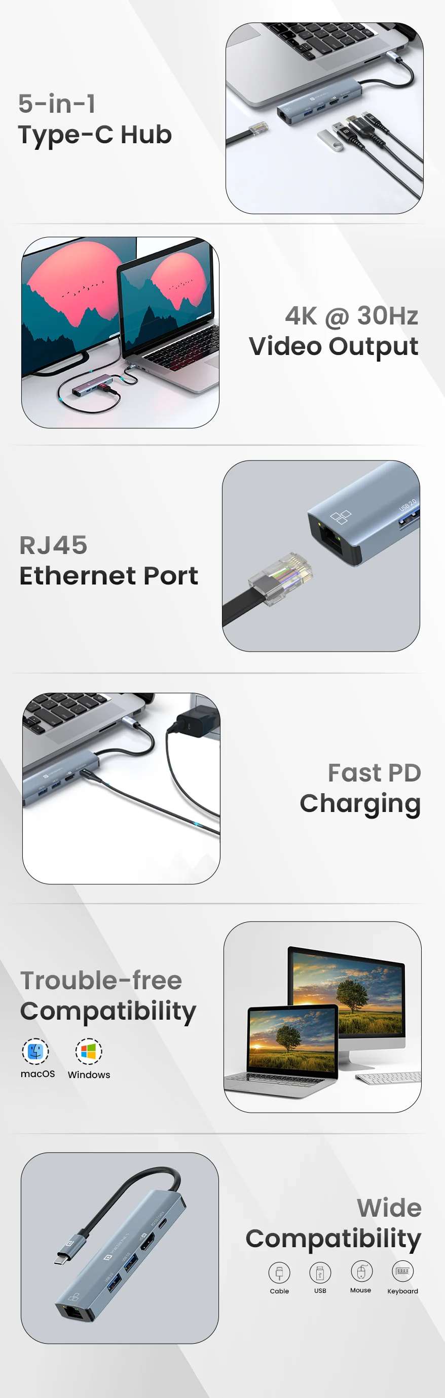 Portronics Mport 51 5-in-1 Type C HUB with RJ 45 Ethernet Port/ 5Gbps Data Transfe/ HDMI Port/ USB 3.0/ PD Quick Charge/ 4K Ultra HD Data Quality (Grey)