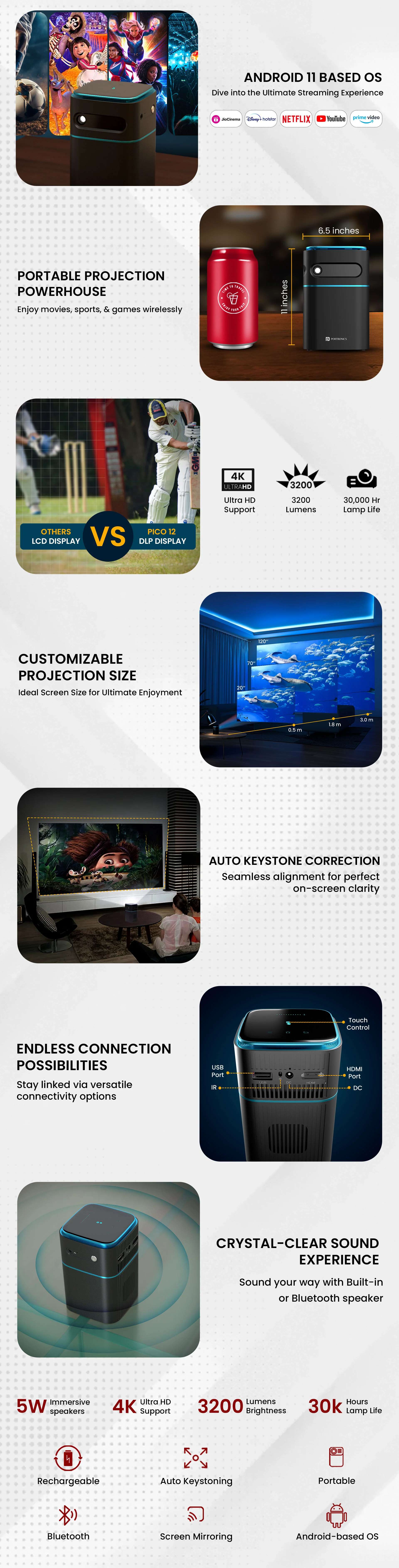 Portronics Pico 12 Portable Smart Projector with Android 11/ 4K Ultra HD Support/ Rechargeable/ 3200 Lumens/ DLP Technology/ 120″ Max Display/ Auto Keystoning/ 5W Speaker (Black)