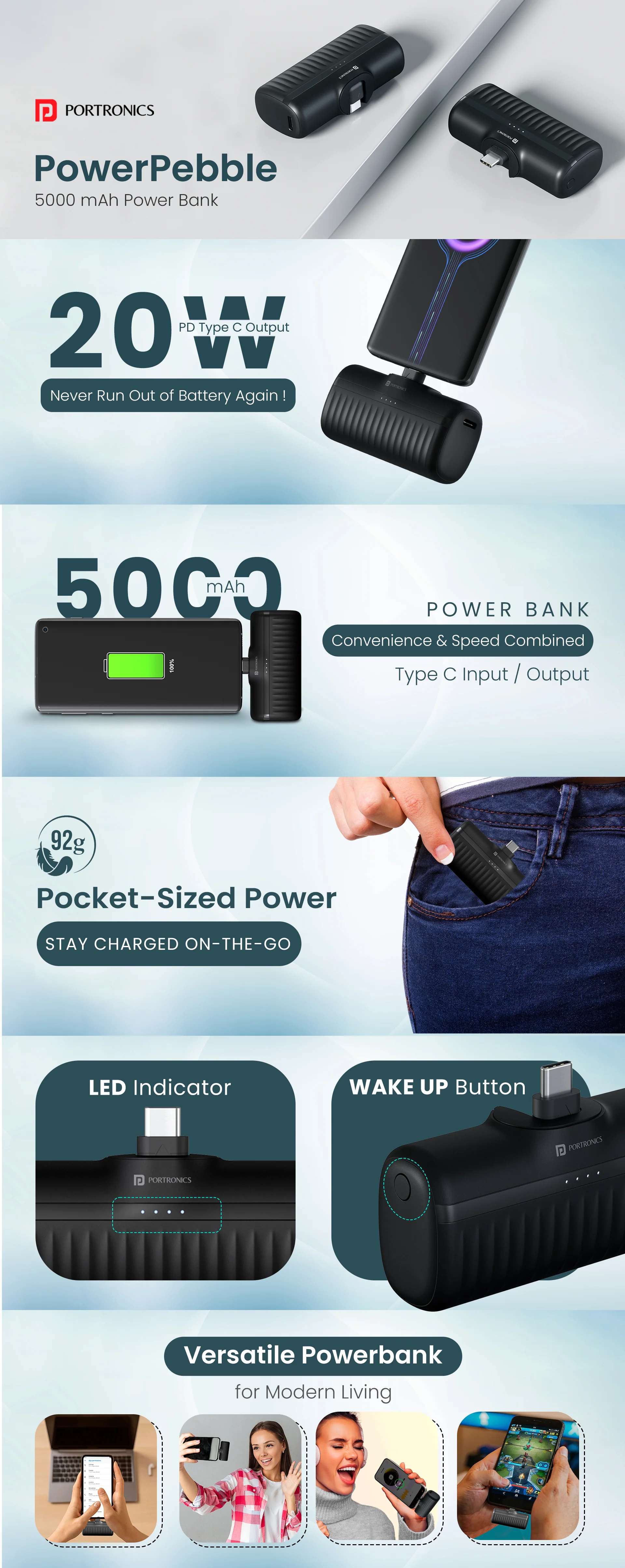 Portronics Power Pebble 5000mAh 20W Fast Charging Powerbank, in-Built Foldable Type C Input/Output Pin, Type C PD Output, LED Battery Indicator, Compatible with Type C Smartphone, iPhone – Black