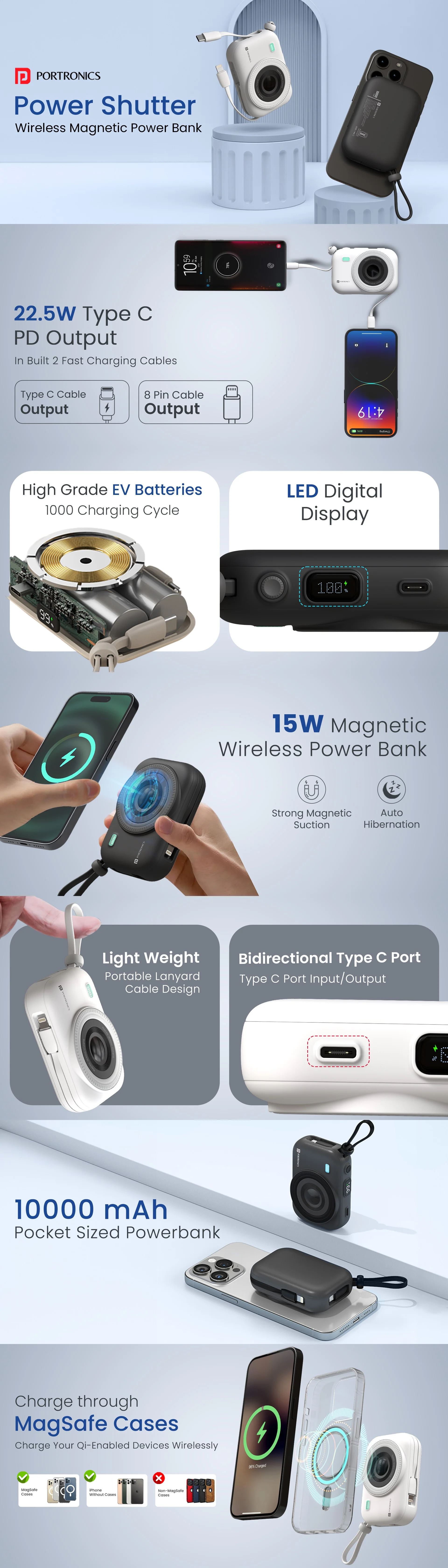 Portronics Power Shutter PowerBank – 15W Wireless Charging/ 22.5W Type C PD Output/ In Built Type C and 8 Pin Cable/ LED Display (White)