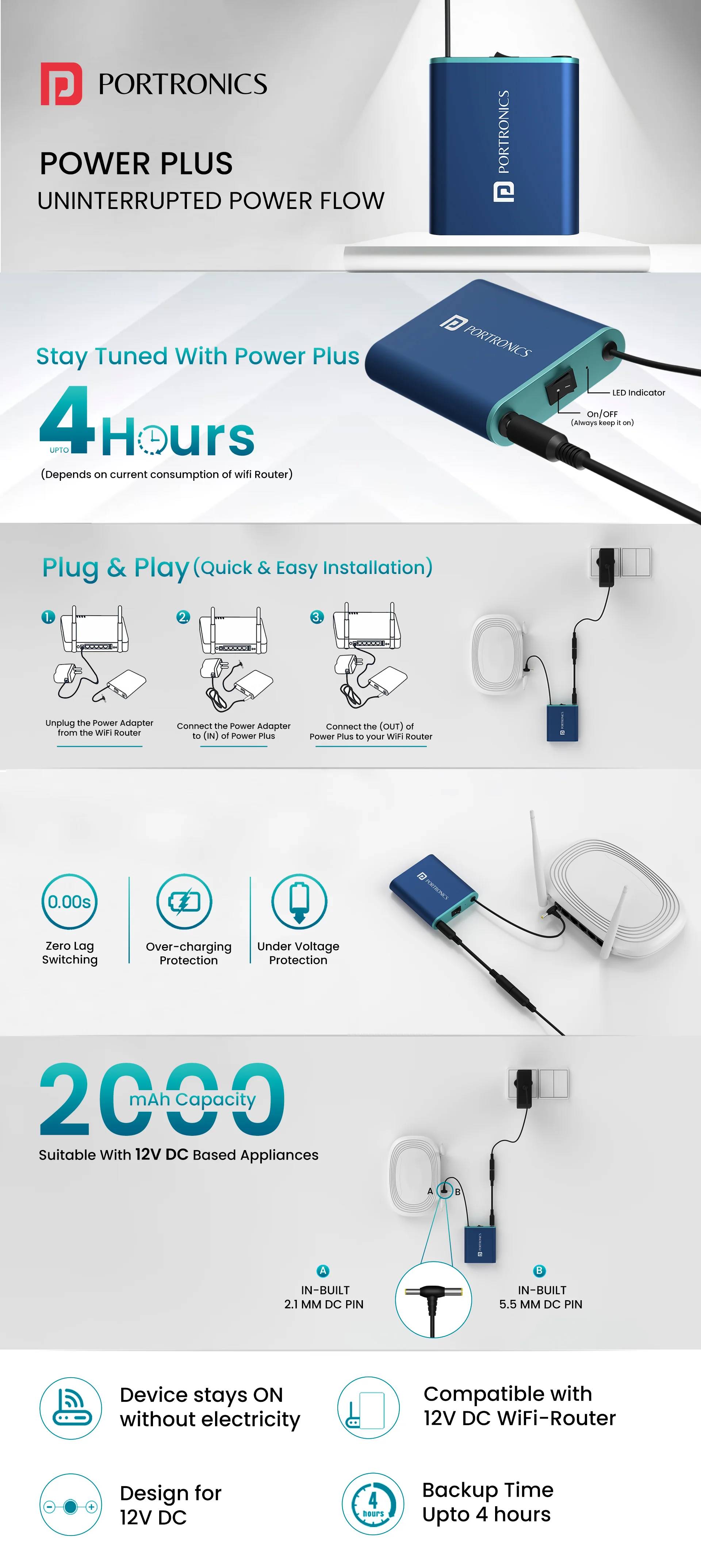 Extended Backup Power Smart Power-Cut Solution : Power Plus provides battery backup for your router and other devices, keeping your Wi-Fi and internet connection stable. Keep your router, set-top box, and other devices running smoothly when your electric power cuts. Wide compatibility : The Portronics PowerPlus provides backup power to devices in your home such as Wi-Fi routers, set-top boxes, CCTV Cameras, and cordless phones. Keep your essential electronics running during power cuts Intelligent Power Solution: The Portronics Power Plus delivers Up to 4 Hours of Backup Power. Keep watching your favorite shows, browsing the internet, and staying connected Smart Battery Backup: The Portronics PowerPlus supports a standard 12V DC input and features a powerful 2000 mAh battery to keep your smart home devices running for hours. To get the most out of it, simply charge the PowerPlus for 3 hours before using it for the first time. Quick Installation: Forget complicated setups, the Portronics PowerPlus is ready to go in minutes. Simply unpack, connect your devices, and enjoy uninterrupted power for your home in minutes. 1-Year Warranty: Relax, the Portronics PowerPlus is covered by a 1-year warranty. You will be at peace as the warranty will keep your devices going for a year (and likely even longer!). Importer/Manufacturer/Packer : Portronics Digital Private Limited, Ground Floor and First Floor, Property No. D 8 Upper Basement, Sector 8, Noida, Gautam Buddha Nagar, Uttar Pradesh, 201301