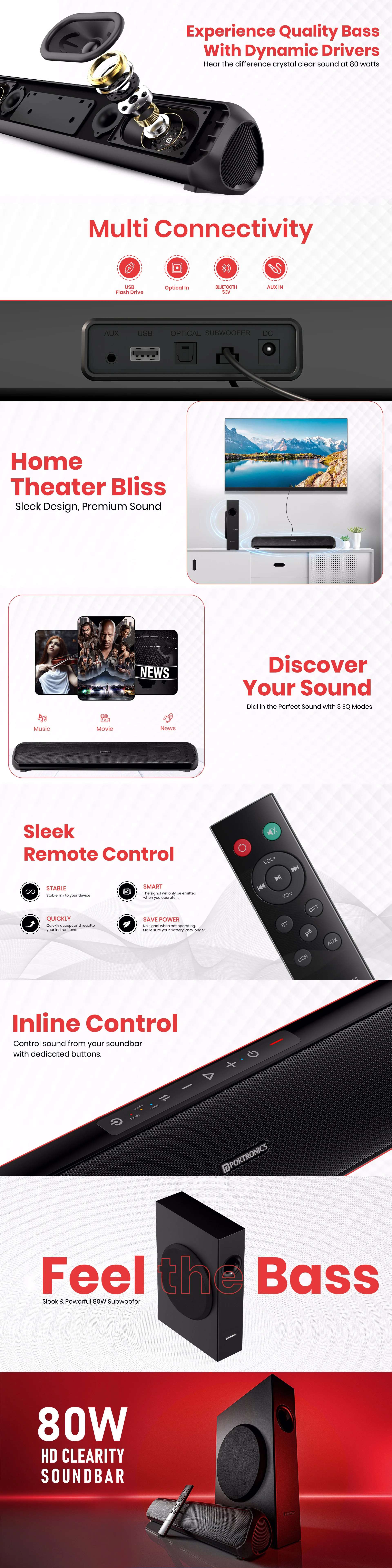Portronics Pure Sound Pro X 80W Bluetooth Soundbar with Wired Subwoofer for Deep Bass/ 2.1 Channel Home Theatre/ HD Sound/ 3EQ Modes/ BT 5.3V/ HDMI/ AUX in USB Port/ Sleek Design & Remote Control (Black)