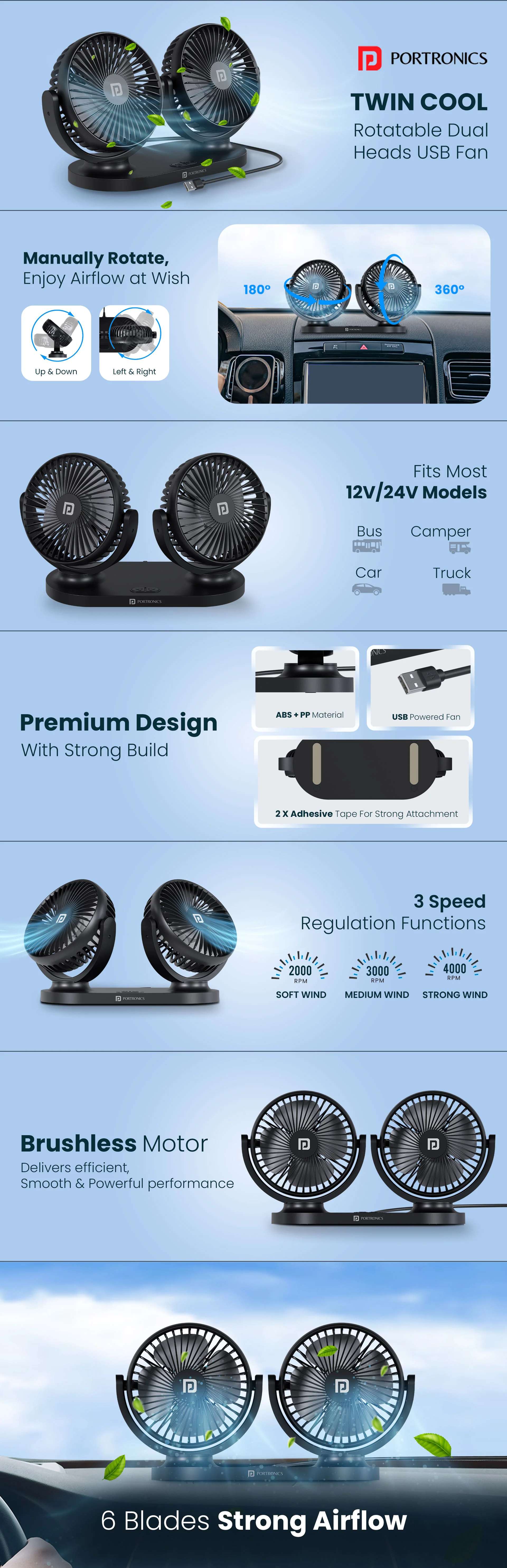Powerful Cooling Up to 4000 RPM: Enjoy intense cooling in your car with this Portronics dual-head USB fan. The brushless motor boosts fan speed up to 4000 RPM, ensuring guaranteed effective cooling.