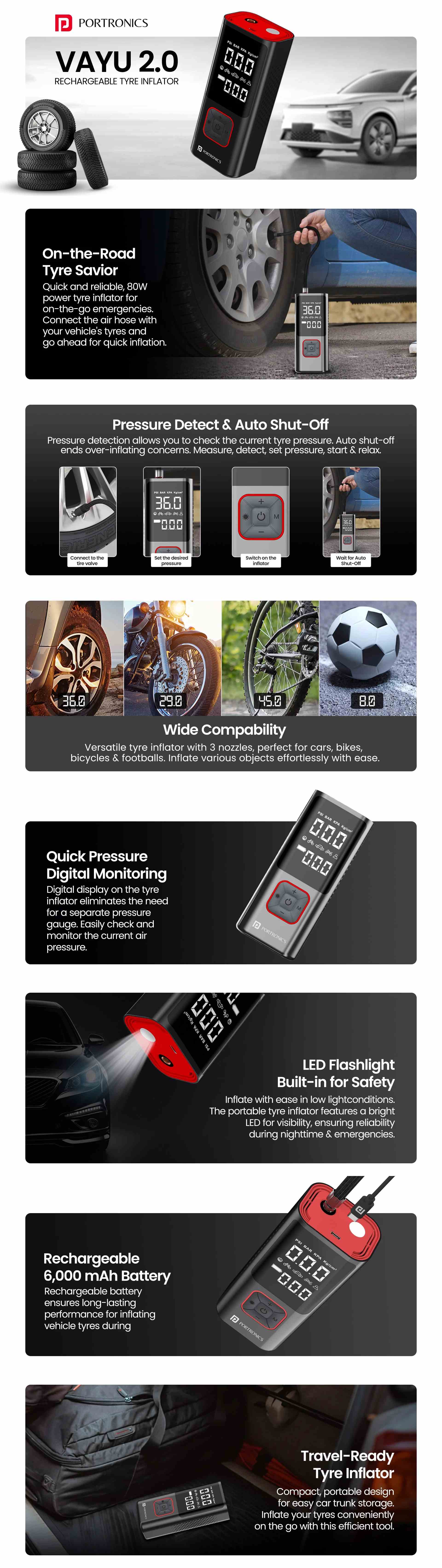 6,000 mAh Battery: Boasting a robust 6,000 mAh battery, the Portronics Vayu 2.0 ensures consistent and reliable inflation for tires, bikes, and sports equipment, guaranteeing extended usability and peace of mind. Precision Inflation Control: Featuring advanced auto pressure detection and preset pressure modes, this inflator delivers precise inflation results, eliminating guesswork and ensuring optimal tire pressure for enhanced safety and performance. Rapid Convenient Charging: With its convenient Type-C charging port, recharging is a breeze, offering swift and hassle-free replenishment of power, minimizing downtime and maximizing efficiency. Built-in Flashlight: Equipped with an integrated LED flashlight, this inflator provides added visibility during emergencies or low-light conditions, prioritizing user safety and convenience on the road or in outdoor settings. Intelligent Auto Shut-off: Engineered with an intelligent auto-shutoff function, this inflator automatically stops when the desired pressure is reached, preventing over-inflation and safeguarding tires. Portable User-Friendly Design: Designed with portability in mind, this inflator boasts a compact and ergonomic build, ensuring easy storage and promoting effortless and enjoyable usage experiences. Versatile Inflation Capability: Tailored to accommodate a wide range of inflation needs, from car tires to bicycles and even footballs, offering unmatched versatility for various applications. Warranty – 12 Months Importer/Manufacturer/Packer – Portronics Digital Private Limited, Ground Floor and First Floor, Property No. D 8 Upper Basement, Sector 8, Noida, Gautam Buddha Nagar, Uttar Pradesh, 201301