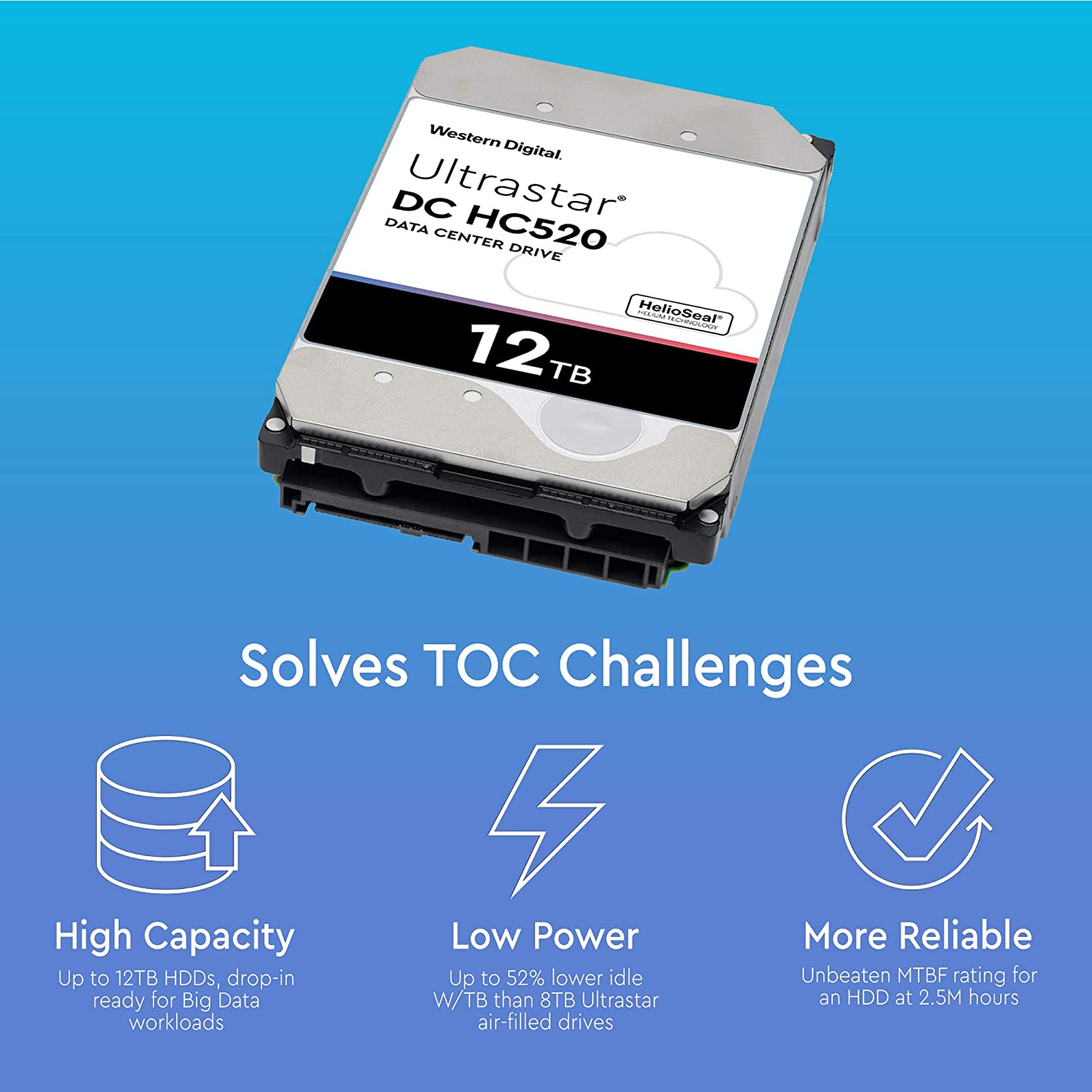Laying the foundation for a worry-free data center, Western Digital delivers capacity to conquer the data explosion ??Ultrastar DC HC520, previously known as Ultrastar He12 and part of our HC500 series of helium-filled hard drives. Designed to handle workloads up to 550TB per year, the Ultrastar DC HC520 is the industry?? first 12TB drive and uses traditional perpendicular magnetic recording (PMR) technology to make it dropin ready for any enterprise-capacity application or environment. The stable internal environment created by fourth-generation HelioSeal? technology enables a new 8-disk design, increasing the capacity by 20% when compared to the 7-disk design of the prior generation, Ultrastar DC HC510. This high capacity helium drive offers one of the lowest power profiles in the industry to help data center architects meet eco-environmental goals and requirements. Targeted at 2.5M hours MTBF2, the Ultrastar DC HC520 provides the highest reliability rating available of all HDDs on the market today by building on the successful design of its 10TB, 8TB and 6TB predecessors. Trust Western Digital and the Ultrastar DC HC520 to deliver more capacity, more efficiency, more reliability and more value to your data center.